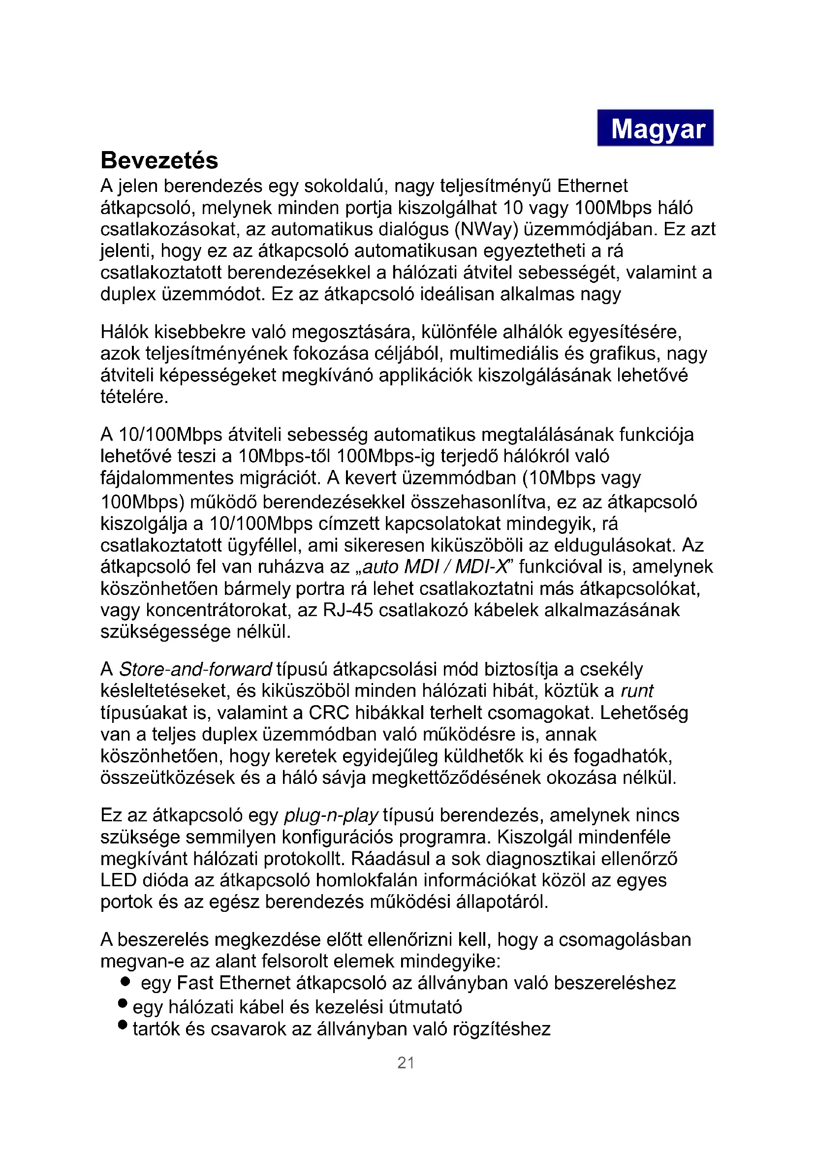 20Magyar. Bevezetés A jelen berendezés egy sokoldalú, nagy teljesítményű Ethernet átkapcsoló, melynek minden portja kiszolgálhat 10 vagy 100Mbps háló csatlakozásokat, az automatikus dialógus (NWay) üzemmódjában. Ez azt jelenti, hogy ez az átkapcsoló automatikusan egyeztetheti a rá csatlakoztatott berendezésekkel a hálózati átvitel sebességét, valamint a duplex üzemmódot. Ez az átkapcsoló ideálisan alkalmas nagy Hálók kisebbekre való megosztására, különféle alhálók egyesítésére, azok teljesítményének fokozása céljából, multimediális és grafikus, nagy átviteli képességeket megkívánó applikációk kiszolgálásának lehetővé tételére. A 10/100Mbps átviteli sebesség automatikus megtalálásának funkciója lehetővé teszi a 10Mbps-től 100Mbps-ig terjedő hálókról való fájdalommentes migrációt. A kevert üzemmódban (10Mbps vagy 100Mbps) működő berendezésekkel összehasonlítva, ez az átkapcsoló kiszolgálja a 10/100Mbps címzett kapcsolatokat mindegyik, rá csatlakoztatott ügyféllel, ami sikeresen kiküszöböli az eldugulásokat. Az átkapcsoló fel van ruházva az „auto MDI / MDI-X” funkcióval is, amelynek köszönhetően bármely portra rá lehet csatlakoztatni más átkapcsolókat, vagy koncentrátorokat, az RJ-45 csatlakozó kábelek alkalmazásának szükségessége nélkül. A Store-and-forward típusú átkapcsolási mód biztosítja a csekély késleltetéseket, és kiküszöböl minden hálózati hibát, köztük a runt típusúakat is, valamint a CRC hibákkal terhelt csomagokat. Lehetőség van a teljes duplex üzemmódban való működésre is, annak köszönhetően, hogy keretek egyidejűleg küldhetők ki és fogadhatók, összeütközések és a háló sávja megkettőződésének okozása nélkül. Ez az átkapcsoló egy plug-n-play típusú berendezés, amelynek nincs szüksége semmilyen konfigurációs programra. Kiszolgál mindenféle megkívánt hálózati protokollt. Ráadásul a sok diagnosztikai ellenőrző LED dióda az átkapcsoló homlokfalán információkat közöl az egyes portok és az egész berendezés működési állapotáról. A beszerelés megkezdése előtt ellenőrizni kell, hogy a csomagolásban megvan-e az alant felsorolt elemek mindegyike: