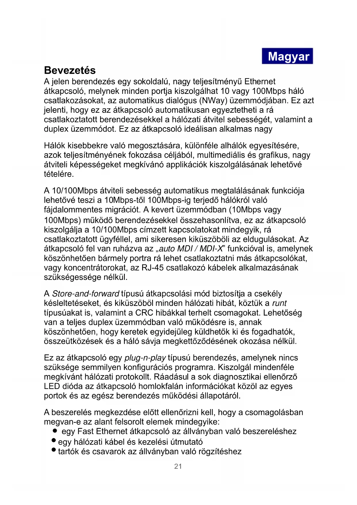 20Magyar. Bevezetés A jelen berendezés egy sokoldalú, nagy teljesítményű Ethernet átkapcsoló, melynek minden portja kiszolgálhat 10 vagy 100Mbps háló csatlakozásokat, az automatikus dialógus (NWay) üzemmódjában. Ez azt jelenti, hogy ez az átkapcsoló automatikusan egyeztetheti a rá csatlakoztatott berendezésekkel a hálózati átvitel sebességét, valamint a duplex üzemmódot. Ez az átkapcsoló ideálisan alkalmas nagy Hálók kisebbekre való megosztására, különféle alhálók egyesítésére, azok teljesítményének fokozása céljából, multimediális és grafikus, nagy átviteli képességeket megkívánó applikációk kiszolgálásának lehetővé tételére. A 10/100Mbps átviteli sebesség automatikus megtalálásának funkciója lehetővé teszi a 10Mbps-től 100Mbps-ig terjedő hálókról való fájdalommentes migrációt. A kevert üzemmódban (10Mbps vagy 100Mbps) működő berendezésekkel összehasonlítva, ez az átkapcsoló kiszolgálja a 10/100Mbps címzett kapcsolatokat mindegyik, rá csatlakoztatott ügyféllel, ami sikeresen kiküszöböli az eldugulásokat. Az átkapcsoló fel van ruházva az „auto MDI / MDI-X” funkcióval is, amelynek köszönhetően bármely portra rá lehet csatlakoztatni más átkapcsolókat, vagy koncentrátorokat, az RJ-45 csatlakozó kábelek alkalmazásának szükségessége nélkül. A Store-and-forward típusú átkapcsolási mód biztosítja a csekély késleltetéseket, és kiküszöböl minden hálózati hibát, köztük a runt típusúakat is, valamint a CRC hibákkal terhelt csomagokat. Lehetőség van a teljes duplex üzemmódban való működésre is, annak köszönhetően, hogy keretek egyidejűleg küldhetők ki és fogadhatók, összeütközések és a háló sávja megkettőződésének okozása nélkül. Ez az átkapcsoló egy plug-n-play típusú berendezés, amelynek nincs szüksége semmilyen konfigurációs programra. Kiszolgál mindenféle megkívánt hálózati protokollt. Ráadásul a sok diagnosztikai ellenőrző LED dióda az átkapcsoló homlokfalán információkat közöl az egyes portok és az egész berendezés működési állapotáról. A beszerelés megkezdése előtt ellenőrizni kell, hogy a csomagolásban megvan-e az alant felsorolt elemek mindegyike:
