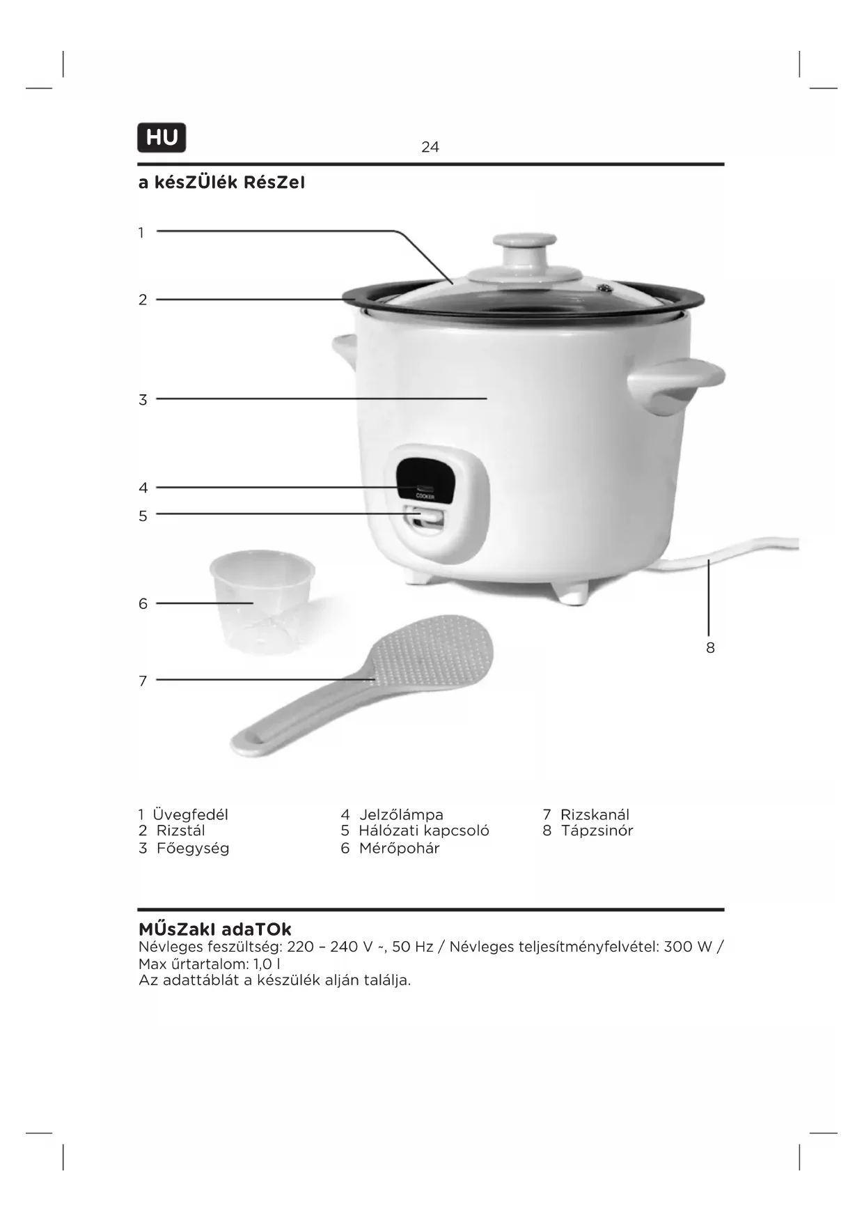 Névleges feszültség: 220 – 240 V ~, 50 Hz / Névleges teljesítményfelvétel: 300 W / Max űrtartalom: 1,0 l Az adattáblát a készülék alján találja. MŰsZakI adaTOk 1 Üvegfedél 2 Rizstál 3 Főegység 4 Jelzőlámpa 5 Hálózati kapcsoló 6 Mérőpohár 7 Rizskanál 8 Tápzsinór