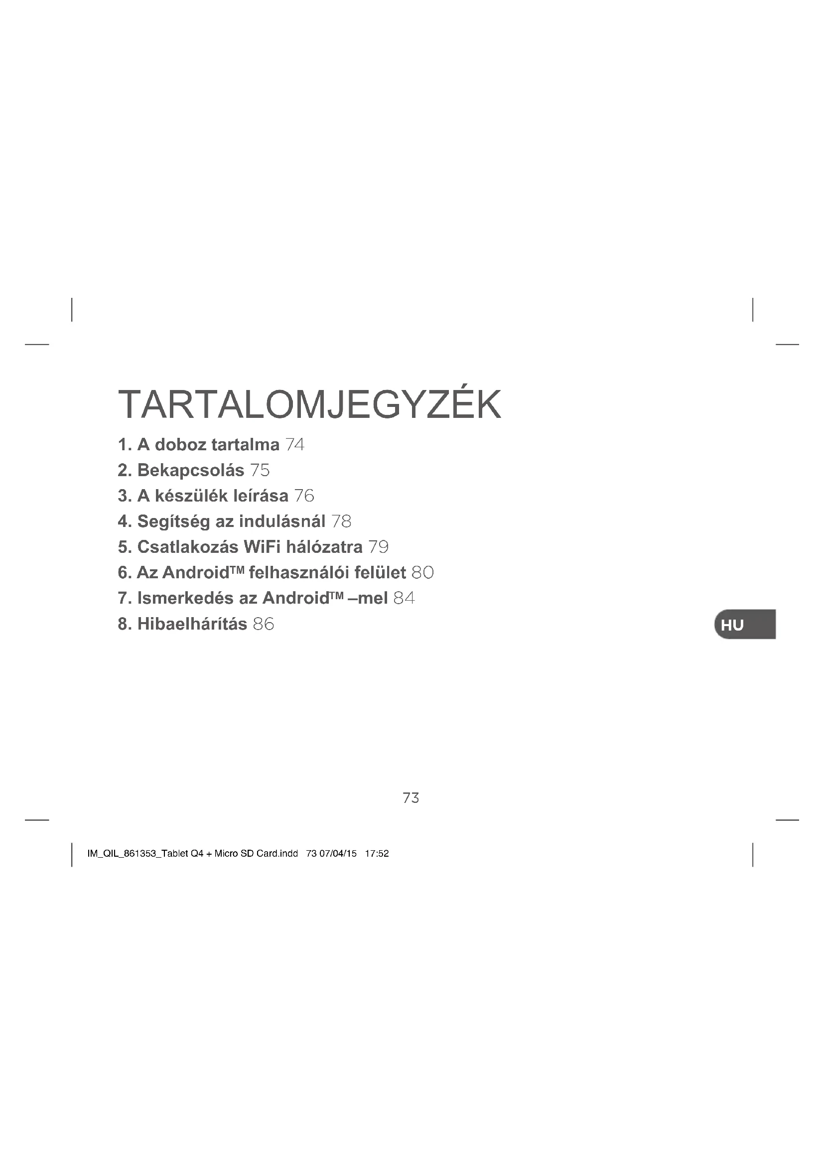- Külső alkalmazások FOGÁSOK: A táblagép beállításánál azt javasoljuk, hogy azt a WIFI hálózatot használja, amelyet rendszeresen használni fog. IM_QIL_861353_Tablet Q4 + Micro SD Card.indd 78 07/04/15 17:5278