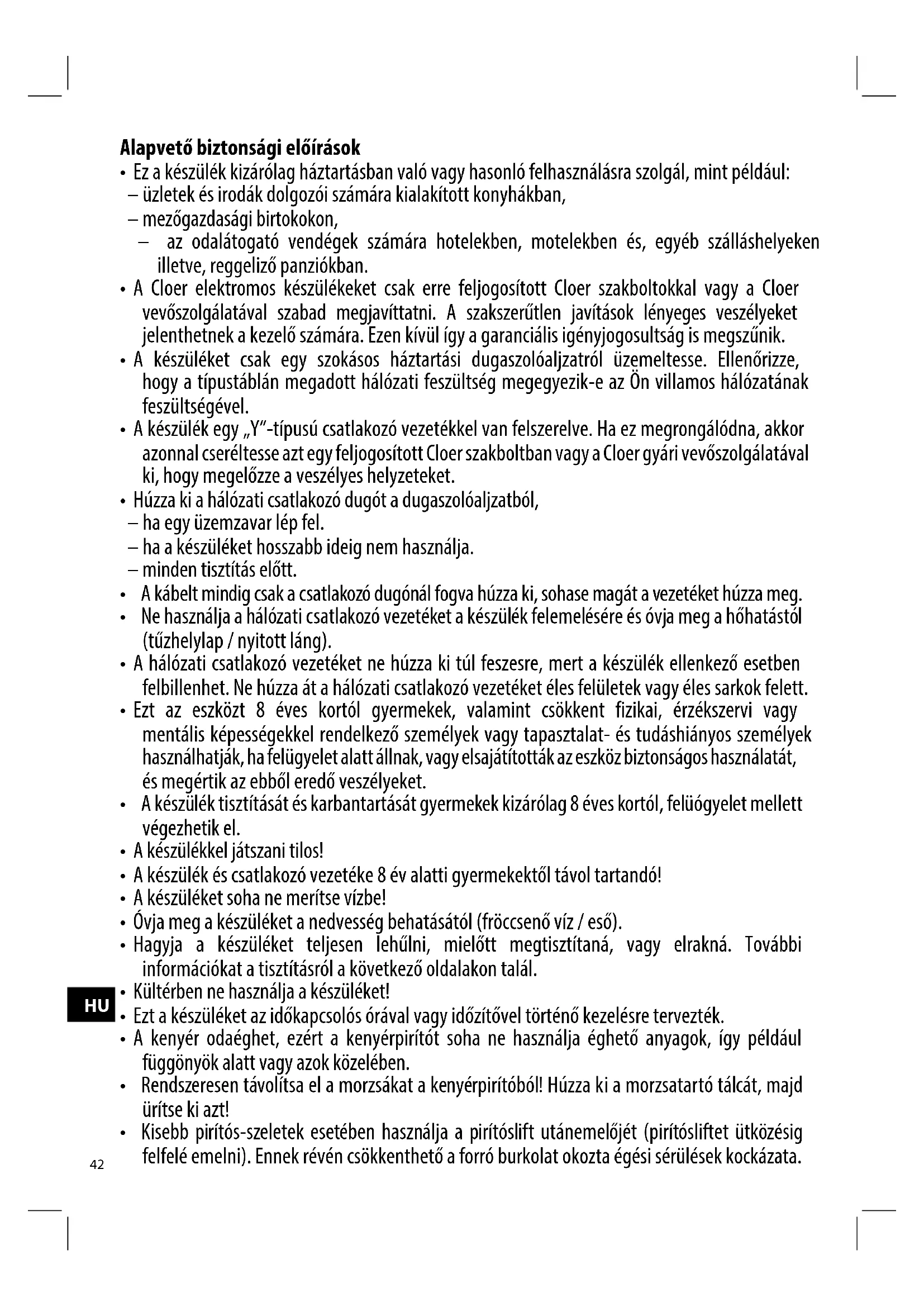 Ha elofordulna, hogy az On Cloer gyartmanyu keszuleke meghibasodik, kerjuk, forduljon sajat Cloer szakkereskedojhez, vagy a Cloer gyar ugyfelszolgatalhoz. A Cloer elektromos keszulekei megfelelnek az ervenyes EG iranyelveknek es biztonsagi elora-soknak.
