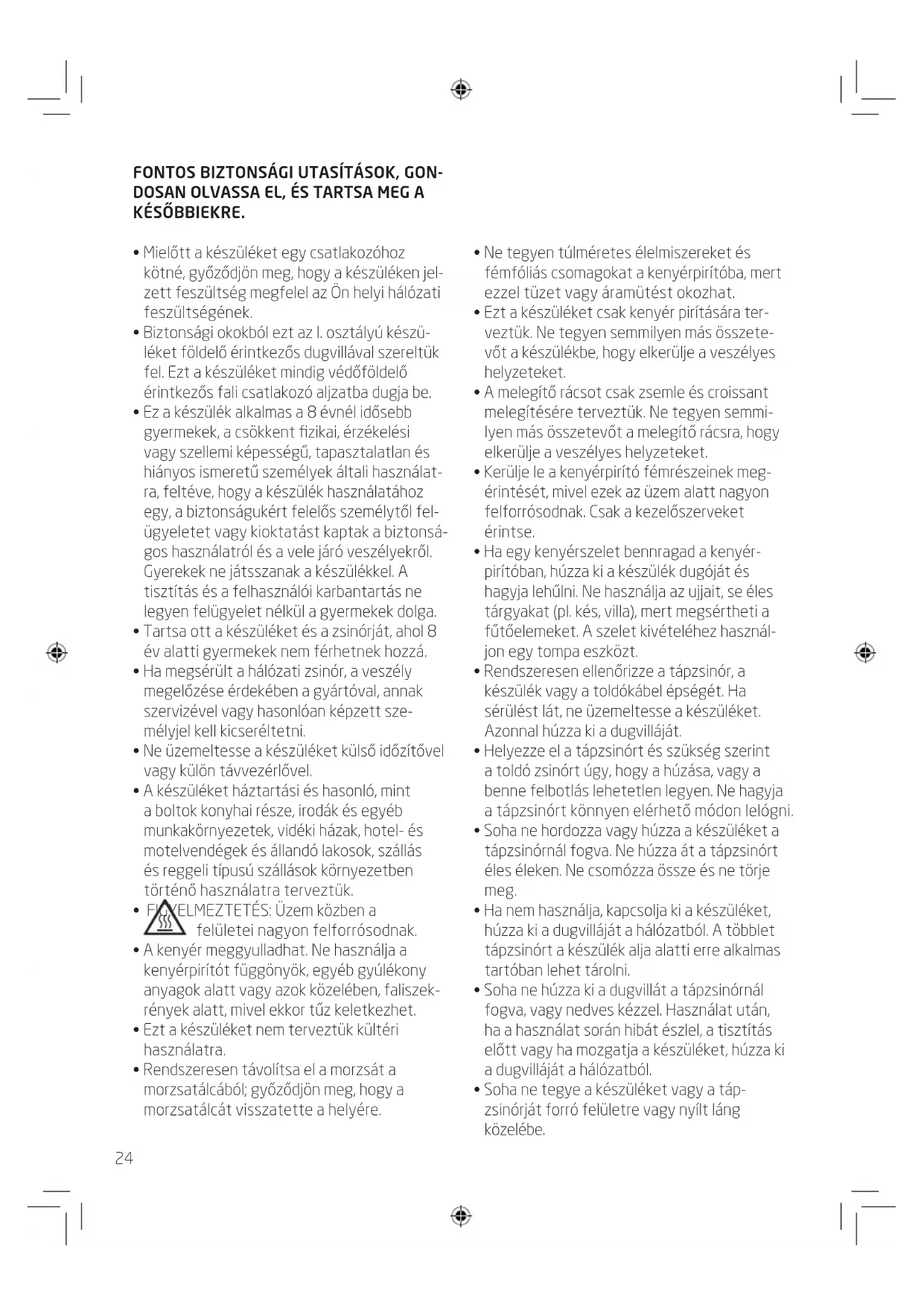 - Ezt a készüléket csak kenyér pirítására ter- veztük. Ne tegyen semmilyen más összete- vőt a készülékbe, hogy elkerülje a veszélyes helyzeteket.