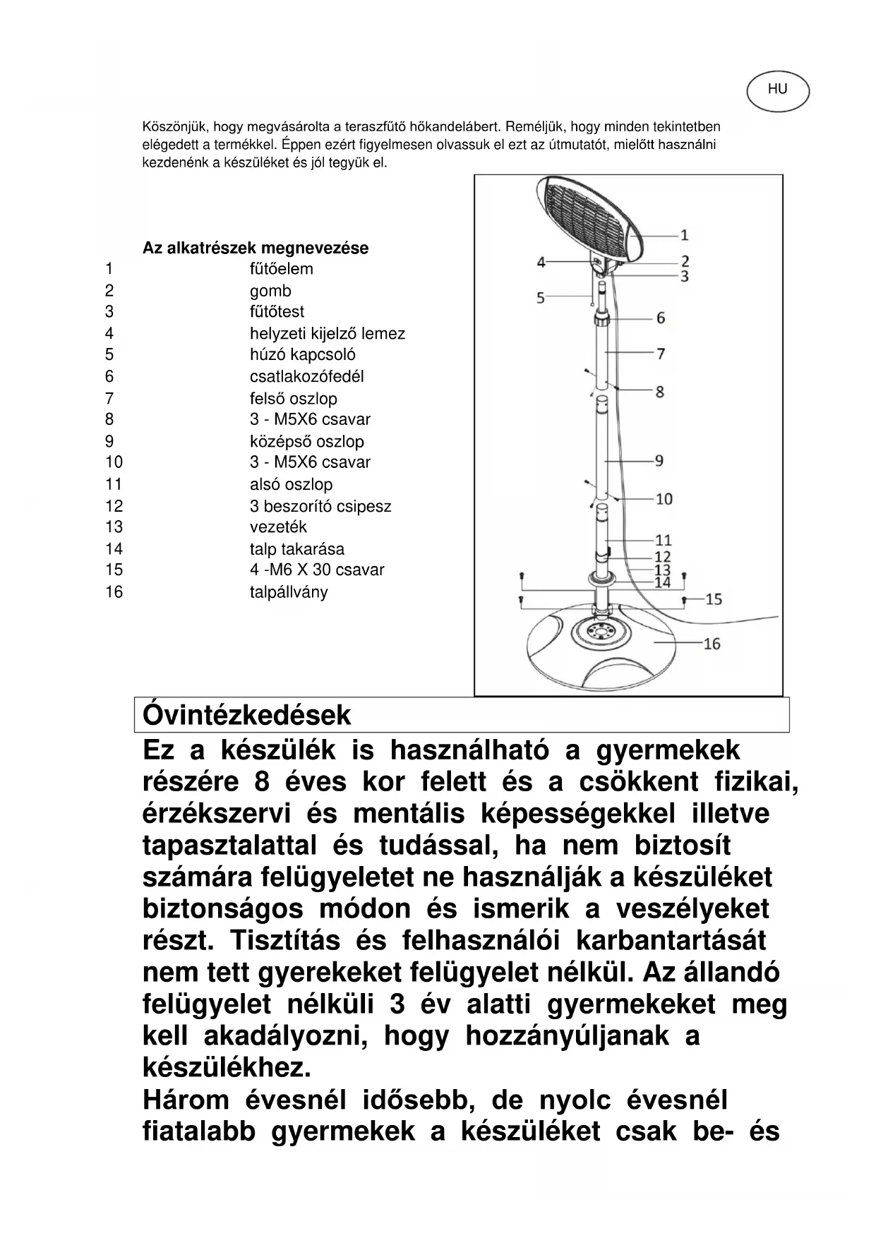 Óvintézkedések Ez a készülék is használható a gyermekek részére 8 éves kor felett és a csökkent fizikai, érzékszervi és mentális képességekkel illetve tapasztalattal és tudással, ha nem biztosít számára felügyeletet ne használják a készüléket biztonságos módon és ismerik a veszélyeket részt. Tisztítás és felhasználói karbantartását nem tett gyerekeket felügyelet nélkül. Az állandó felügyelet nélküli 3 év alatti gyermekeket meg kell akadályozni, hogy hozzányúljanak a készülékhez. Három évesnél idősebb, de nyolc évesnél fiatalabb gyermekek a készüléket csak be- éskikapcsolhatják azzal a feltétellel, hogy a készülék a rendes használati helyzetében legyen elhelyezve vagy felszerelve, kioktatták őket a készülék biztonságos használatáról, felügyelet alatt vannak, és a lehetséges veszélyeket megértették. Három évesnél idősebb, de nyolc évesnél fiatalabb gyermekek a készüléket nem dughatják be a konnektorba, nem szabályozhatják, tisztíthatják, és karbantartást sem végezhetnek rajta. FIGYELMEZTETÉSEK!