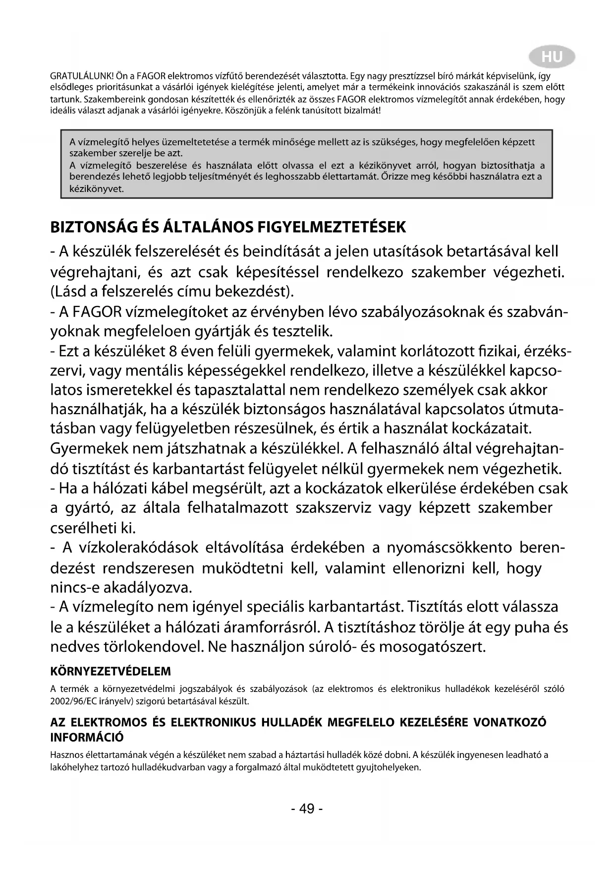 - Обратитесь в центр технического обслуживания.HU GRATULÁLUNK! Ön a FAGOR elektromos vízfűtő berendezését választotta. Egy nagy presztízzsel bíró márkát képviselünk, így elsődleges prioritásunkat a vásárlói igények kielégítése jelenti, amelyet már a termékeink innovációs szakaszánál is szem előtt tartunk. Szakembereink gondosan készítették és ellenőrizték az összes FAGOR elektromos vízmelegítőt annak érdekében, hogy ideális választ adjanak a vásárlói igényekre. Köszönjük a felénk tanúsított bizalmát! BIZTONSÁG ÉS ÁLTALÁNOS FIGYELMEZTETÉSEK - A készülék felszerelését és beindítását a jelen utasítások betartásával kell végrehajtani, és azt csak képesítéssel rendelkezo szakember végezheti. (Lásd a felszerelés címu bekezdést). - A FAGOR vízmelegítoket az érvényben lévo szabályozásoknak és szabván- yoknak megfeleloen gyártják és tesztelik. - Ezt a készüléket 8 éven felüli gyermekek, valamint korlátozott zikai, érzéks- zervi, vagy mentális képességekkel rendelkezo, illetve a készülékkel kapcso- latos ismeretekkel és tapasztalattal nem rendelkezo személyek csak akkor használhatják, ha a készülék biztonságos használatával kapcsolatos útmuta- tásban vagy felügyeletben részesülnek, és értik a használat kockázatait. Gyermekek nem játszhatnak a készülékkel. A felhasználó által végrehajtan- dó tisztítást és karbantartást felügyelet nélkül gyermekek nem végezhetik. - Ha a hálózati kábel megsérült, azt a kockázatok elkerülése érdekében csak a gyártó, az általa felhatalmazott szakszerviz vagy képzett szakember cserélheti ki. - A vízkolerakódások eltávolítása érdekében a nyomáscsökkento beren- dezést rendszeresen muködtetni kell, valamint ellenorizni kell, hogy nincs-e akadályozva. - A vízmelegíto nem igényel speciális karbantartást. Tisztítás elott válassza le a készüléket a hálózati áramforrásról. A tisztításhoz törölje át egy puha és nedves törlokendovel. Ne használjon súroló- és mosogatószert.