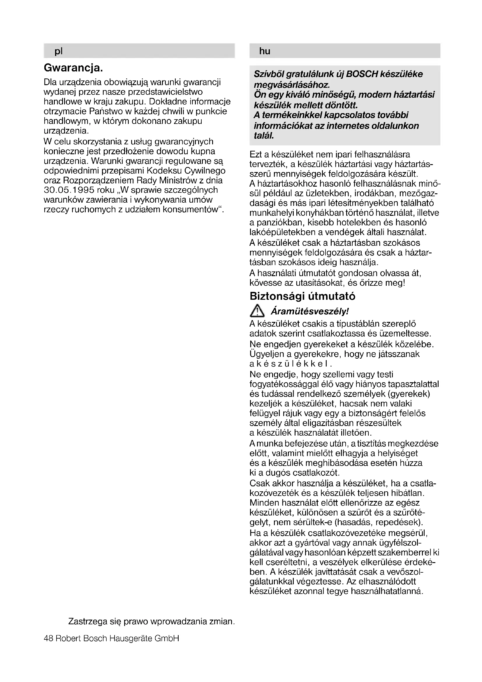 Zastrzega siê prawo wprowadzania zmian. Szívbõl gratulálunk új BOSCH készüléke megvásárlásához. Ön egy kiváló minõségû, modern háztartási készülék mellett döntött. A termékeinkkel kapcsolatos további információkat az internetes oldalunkon talál. huRobert Bosch Hausgeräte GmbH 49 A csatlakozó vezeték ne érintkezzen forró tárgyakkal, ne húzza azt végig éles sarkokon, és ne emelje a készüléket ennél fogva. A készüléket vagy a hálózati csatlakozóvezetéket soha ne merítse vízbe. Csak akkor szedje szét a készüléket, ha a motor áll. A készüléket egy személy általi használatra tervezték. Sérülésveszély! Ne nyúljon kézzel a betöltõnyílásba. Kizárólag a vele szállított tömõeszközt használja! Ne nyúljon az õrlõ pengékhez/a szûrõ alján lévõ pengékhez. Tisztításhoz a szûrõt elõször kefével tisztítsa meg, azután folyó vízzel mossa le vagy mosogatógépben tisztítsa. Bekapcsolásgátló A készüléket csak akkor lehet bekapcsolni,-ha a szûrõtál és a fedél jól van felhelyezve-és a rögzítõfülek megfelelõen vannak reteszelve és beakasztva. Minden használat elõtt ellenõrizze a fedéllezárást! A készülék részei Kérjük, nyissa ki az ábrás oldalt. A ábra 1 Motoregység (kábelrekesszel) 2 Kapcsoló 0/off A készülék kikapcsolása 1 Kapcsolja be a készüléket/ Alacsony sebesség 2 Magas sebesség/ 3 Rostgyûjtõ tartály 4 Rögzítõfülek 5 Szûrõtál (kifolyóval) 6 Szûrõ 7 Fedél 8 Betöltõnyílás 9 Tömõeszköz 10 Légyûjtõ pohár 11 Habelválasztó 12 Légyûjtõ pohár fedele 13 Tisztítókefe A készülék kezelése B ábra Összeszerelés A szûrõtálat tegye be a motoregységbe. Tegye be a szûrõt. Elõtte ellenõrizze, hogy nem sérült-e! Illessze a rostgyûjtõ tartályt a motoregységhez. Helyezze fel a fedelet. Mindkét rögzítõfület akassza be a fedélorrba (1.) és nyomja le, amíg hallhatóan be nem kattannak (2.). Tegye a kiöntõvel rendelkezõ légyûjtõ poharat a kifolyó alá. – Vegye ki a habelválasztót a légyûjtõ pohárból, ha habbal szeretné a levet elkészíteni. – A kifröccsenés elkerülése érdekében tegye rá a fedelet a légyûjtõ pohárra. Dugja a tömõeszközt a betöltõnyílásba. A tömõeszköznek van egy vezetõvájata! A gyümölcs és a zöldség elõkészítése Figyelem! Csak teljesen érett és nem fagyasztott gyümölcsöt illetve zöldséget dolgozzon fel. A nem teljesen érett gyümölcs vagy zöldség gyorsan eltömíti a szûrõt.