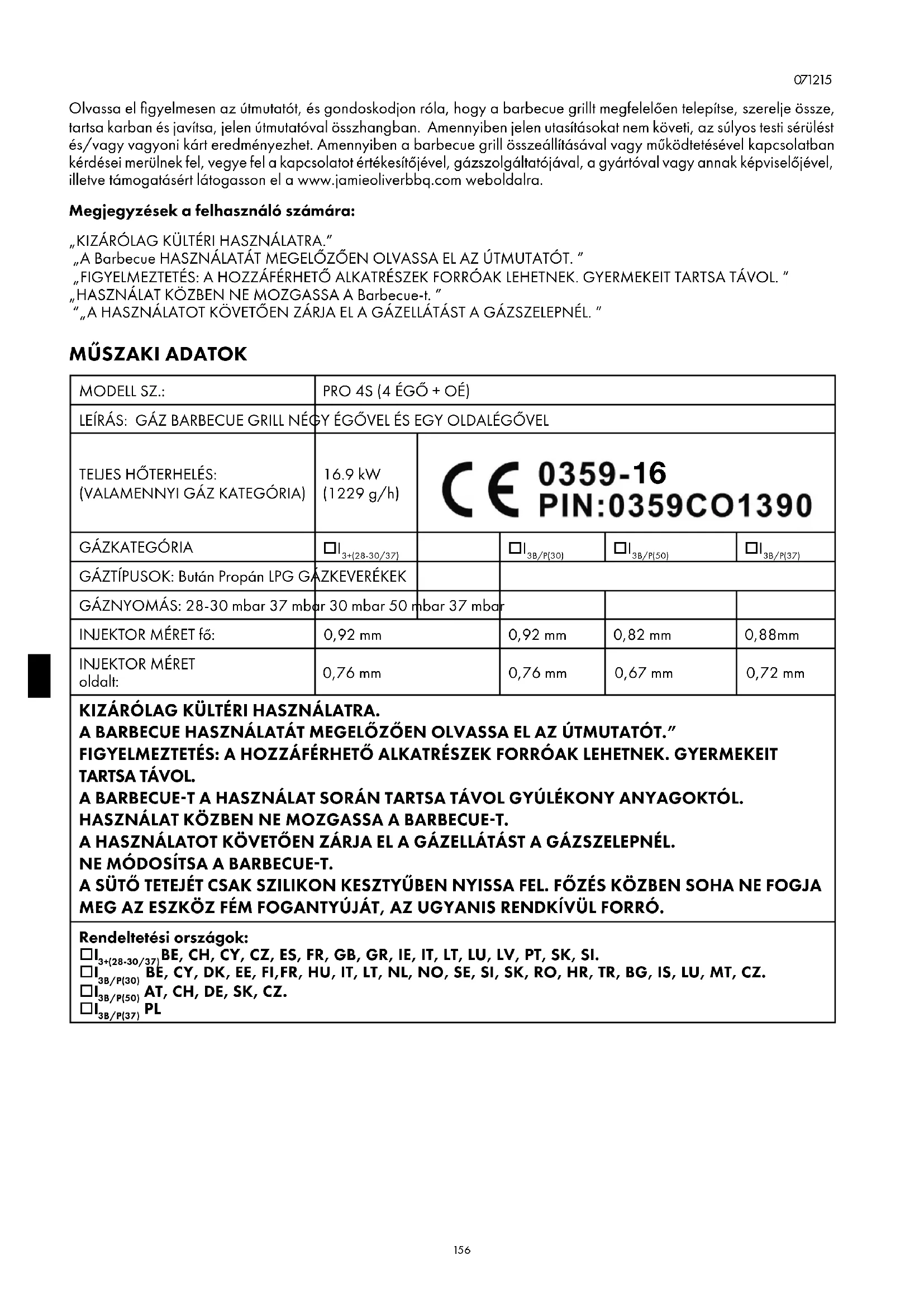Olvassa el figyelmesen az útmutatót, és gondoskodjon róla, hogy a barbecue grillt megfelelően telepítse, szerelje össze, tartsa karban és javítsa, jelen útmutatóval összhangban. Amennyiben jelen utasításokat nem követi, az súlyos testi sérülést és/vagy vagyoni kárt eredményezhet. Amennyiben a barbecue grill összeállításával vagy működtetésével kapcsolatban kérdései merülnek fel, vegye fel a kapcsolatot értékesítőjével, gázszolgáltatójával, a gyártóval vagy annak képviselőjével, illetve támogatásért látogasson el a www.jamieoliverbbq.com weboldalra. Megjegyzések a felhasználó számára: „KIZÁRÓLAG KÜLTÉRI HASZNÁLATRA.” „A Barbecue HASZNÁLATÁT MEGELŐZŐEN OLVASSA EL AZ ÚTMUTATÓT. ” „FIGYELMEZTETÉS: A HOZZÁFÉRHETŐ ALKATRÉSZEK FORRÓAK LEHETNEK. GYERMEKEIT TARTSA TÁVOL. ” „HASZNÁLAT KÖZBEN NE MOZGASSA A Barbecue-t. ” “„A HASZNÁLATOT KÖVETŐEN ZÁRJA EL A GÁZELLÁTÁST A GÁZSZELEPNÉL. ”