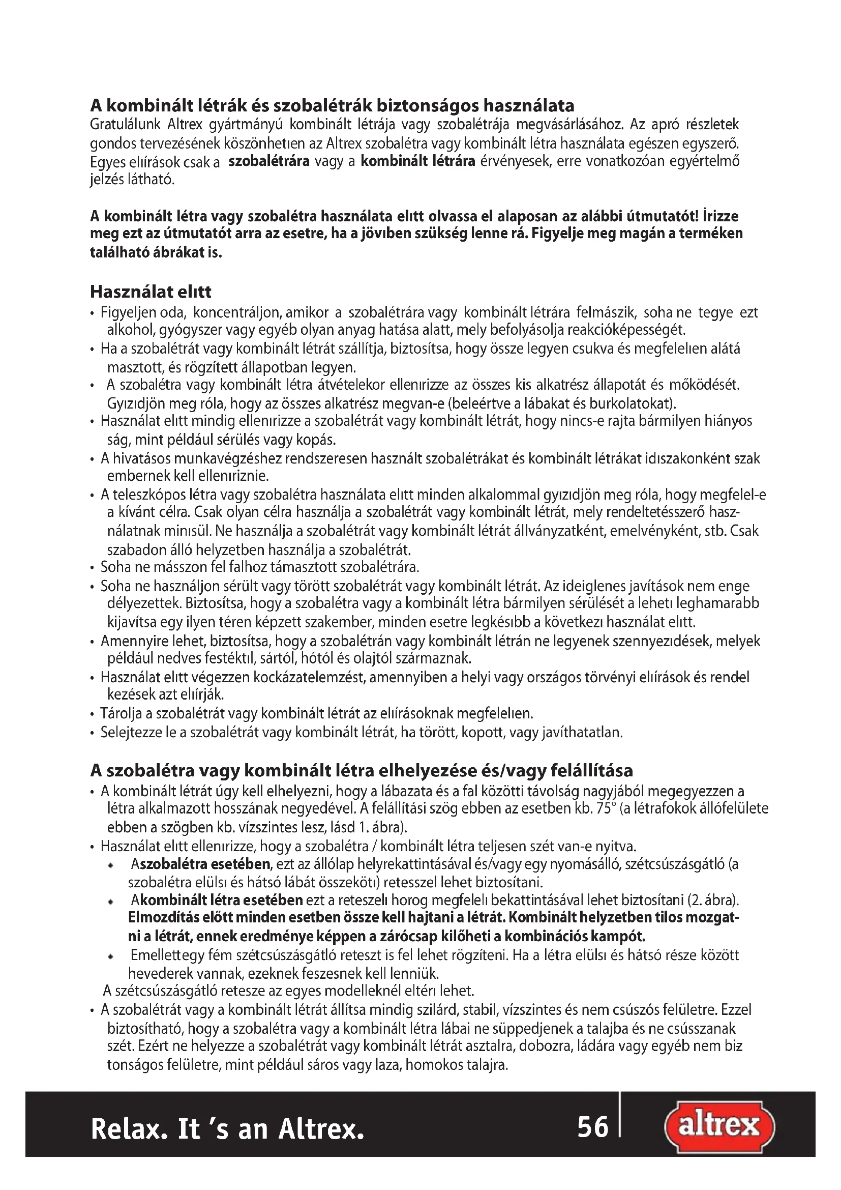 Relax. It ’s an Altrex. ROA kombinált létrák és szobalétrák biztonságos használata Gratulálunk Altrex gyártmányú kombinált létrája vagy szobalétrája megvásárlásához. Az apró részletek gondos tervezésének köszönhetıen az Altrex szobalétra vagy kombinált létra használata egészen egyszerő. Egyes elıírások csak a szobalétrára vagy a kombinált létrára érvényesek, erre vonatkozóan egyértelmő jelzés látható. A kombinált létra vagy szobalétra használata elıtt olvassa el alaposan az alábbi útmutatót! İrizze meg ezt az útmutatót arra az esetre, ha a jövıben szükség lenne rá. Figyelje meg magán a terméken található ábrákat is. Használat elıtt