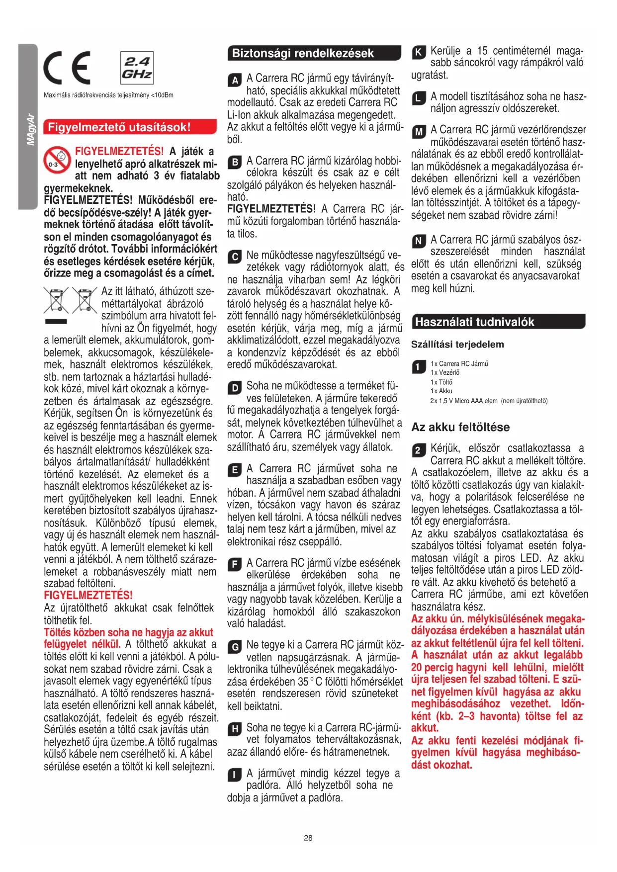 A Carrera RC jármű kizárólag hobbi- célokra készült és csak az e célt szolgáló pályákon és helyeken használ- ható. FIGYELMEZTETÉS! A Carrera RC jár- mű közúti forgalomban történő használa- ta tilos.