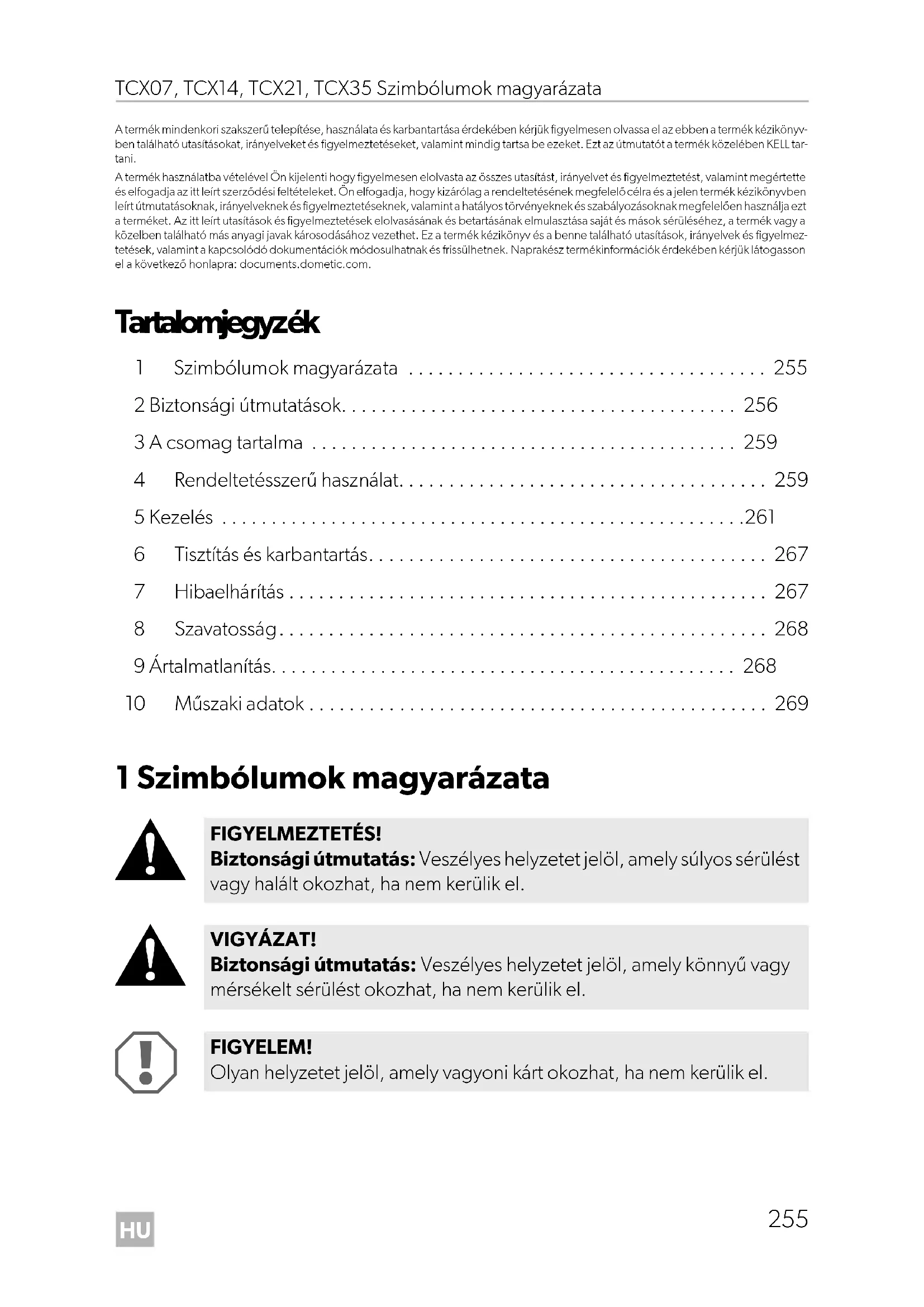 FIGYELMEZTETÉS! Biztonsági útmutatás: Veszélyes helyzetet jelöl, amely súlyos sérülést vagy halált okozhat, ha nem kerülik el. VIGYÁZAT! Biztonsági útmutatás: Veszélyes helyzetet jelöl, amely könnyű vagy mérsékelt sérülést okozhat, ha nem kerülik el. FIGYELEM! Olyan helyzetet jelöl, amely vagyoni kárt okozhat, ha nem kerülik el. DometicTCX07-TCX35_OPM_4445103171_EMEA16-ar_202x-xx-xx.book Page 255 Tuesday, November 29, 2022 11:33 AMHU Biztonsági útmutatások TCX07, TCX14, TCX21, TCX35