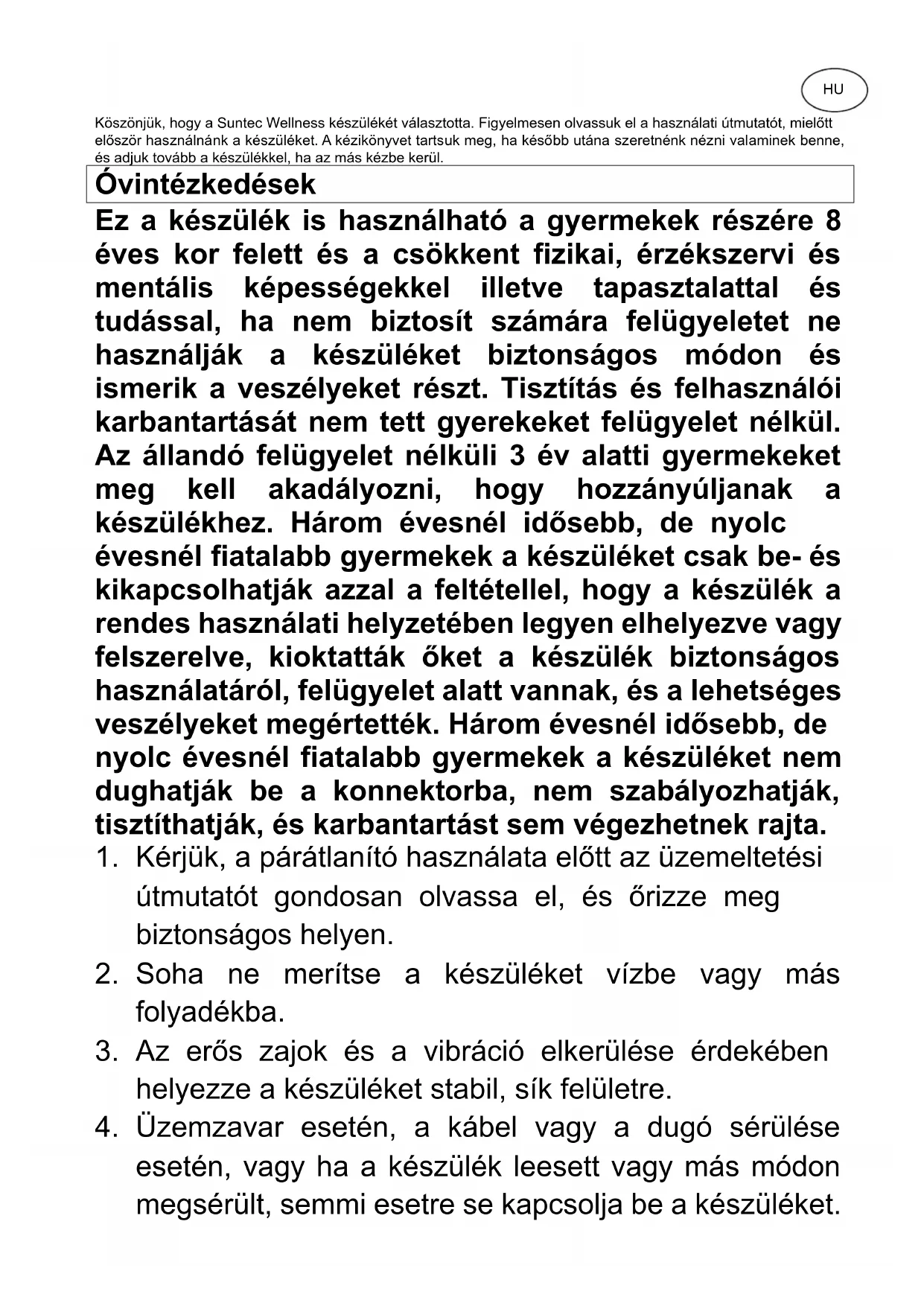DryFix 20 Lumio SUNTEC WELLNESS GMBH / HOLZSTRASSE 2 / 40221 DÜSSELDORF / DEUTSCHLANDHU Köszönjük, hogy a Suntec Wellness készülékét választotta. Figyelmesen olvassuk el a használati útmutatót, mielőtt először használnánk a készüléket. A kézikönyvet tartsuk meg, ha később utána szeretnénk nézni valaminek benne, és adjuk tovább a készülékkel, ha az más kézbe kerül. Óvintézkedések Ez a készülék is használható a gyermekek részére 8 éves kor felett és a csökkent fizikai, érzékszervi és mentális képességekkel illetve tapasztalattal és tudással, ha nem biztosít számára felügyeletet ne használják a készüléket biztonságos módon és ismerik a veszélyeket részt. Tisztítás és felhasználói karbantartását nem tett gyerekeket felügyelet nélkül. Az állandó felügyelet nélküli 3 év alatti gyermekeket meg kell akadályozni, hogy hozzányúljanak a készülékhez. Három évesnél idősebb, de nyolc évesnél fiatalabb gyermekek a készüléket csak be- és kikapcsolhatják azzal a feltétellel, hogy a készülék a rendes használati helyzetében legyen elhelyezve vagy felszerelve, kioktatták őket a készülék biztonságos használatáról, felügyelet alatt vannak, és a lehetséges veszélyeket megértették. Három évesnél idősebb, de nyolc évesnél fiatalabb gyermekek a készüléket nem dughatják be a konnektorba, nem szabályozhatják, tisztíthatják, és karbantartást sem végezhetnek rajta.