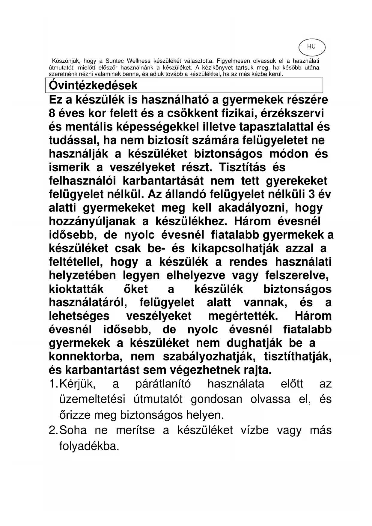 DryFix SUNTEC WELLNESS GMBH / HOLZSTRASSE 2 / 40 221 DÜSSELDORF / DEUTSCHLANDHU Köszönjük, hogy a Suntec Wellness készülékét választotta. Figyelmesen olvassuk el a használati útmutatót, mielőtt először használnánk a készüléket. A kézikönyvet tartsuk meg, ha később utána szeretnénk nézni valaminek benne, és adjuk tovább a készülékkel, ha az más kézbe kerül. Óvintézkedések Ez a készülék is használható a gyermekek részére 8 éves kor felett és a csökkent fizikai, érzékszervi és mentális képességekkel illetve tapasztalattal és tudással, ha nem biztosít számára felügyeletet ne használják a készüléket biztonságos módon és ismerik a veszélyeket részt. Tisztítás és felhasználói karbantartását nem tett gyerekeket felügyelet nélkül. Az állandó felügyelet nélküli 3 év alatti gyermekeket meg kell akadályozni, hogy hozzányúljanak a készülékhez. Három évesnél idősebb, de nyolc évesnél fiatalabb gyermekek a készüléket csak be- és kikapcsolhatják azzal a feltétellel, hogy a készülék a rendes használati helyzetében legyen elhelyezve vagy felszerelve, kioktatták őket a készülék biztonságos használatáról, felügyelet alatt vannak, és a lehetséges veszélyeket megértették. Három évesnél idősebb, de nyolc évesnél fiatalabb gyermekek a készüléket nem dughatják be a konnektorba, nem szabályozhatják, tisztíthatják, és karbantartást sem végezhetnek rajta.