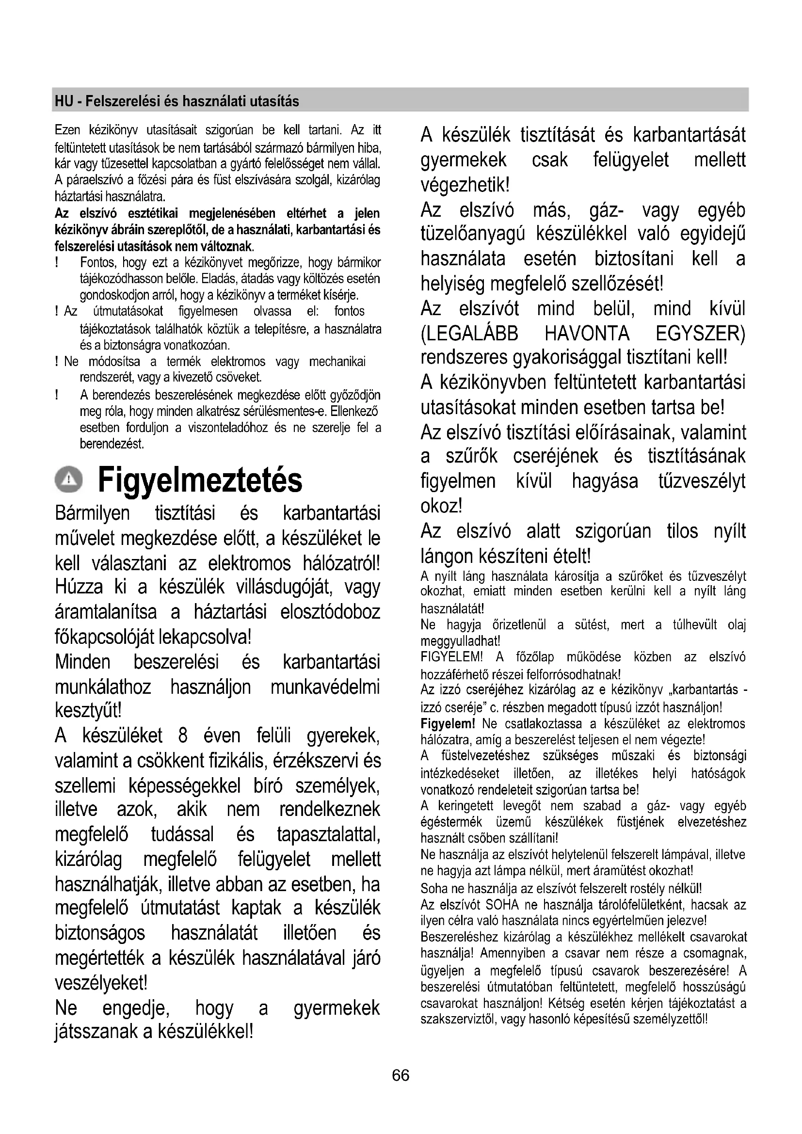 Údržba Čistenie Pri čistení je treba použiť VÝLUČNE látku navlhčenú neutrálnymi tekutými čistiacimi prostriedkami. NEPOUŽÍVAJTE ŽIADNE NÁSTROJE ALEBO POMOCKY NA ČISTENIE. NEPOUŽÍVAJTE ALKOHOL! Protitukový filter Udržuje častice tukov pochádzajúcich z varenia. Musí byť čistený jedenkrát za mesiac s nedráždivými čistiacimi prostriedkami, ručne alebo v umývačke riadu s nízkou teplotou a s krátkym umývacím cyklom. Umývaním v umývačke riadu, protitukový kovový filter môže vyblednúť, ale jeho filtračné vlastnosti sa tým vôbec nezmenia. Uhoľný filter (iba pre filtračnú verziu) Udržuje nepríjemné zápachy pochádzajúce z varenia. Nasýtenie filtra s uhlíkom nastane po viac či menej dlhom užívaní, tj. závisí na type kuchyne a pravidelnom čistení filtra proti mastnotám. V každom prípade je nutné nahradiť filter približne raz za 4 mesiace. NEMÔŽE byť umývaný alebo regenerovaný. Výmena žiaroviek Vypnite odsávač z elektrickej siete. Pozor! Skôr ako sa dotknete žiaroviek, presvedčte sa, že sú chladné. Pre výmenu lámp v malých reflektoroch so štvorcovým tvarom stlačte rám reflektora pri symbole “PUSH”, vymeňte lampu a zatvorte reflektor stlačením stále rám, aby sa zavesil. Používajte len halogénové žiarovky 12V - 20W, max. - G4, a dbajte pritom, aby ste sa ich nedotkli rukami. Ak by osvetlenie nefungovalo, skôr ako zavoláte servis overte správne nasadenie žiaroviek do sedla.66 HU - Felszerelési és használati utasítás Ezen kézikönyv utasításait szigorúan be kell tartani. Az itt feltüntetett utasítások be nem tartásából származó bármilyen hiba, kár vagy tűzesettel kapcsolatban a gyártó felelősséget nem vállal. A páraelszívó a főzési pára és füst elszívására szolgál, kizárólag háztartási használatra. Az elszívó esztétikai megjelenésében eltérhet a jelen kézikönyv ábráin szereplőtől, de a használati, karbantartási és felszerelési utasítások nem változnak. ! Fontos, hogy ezt a kézikönyvet megőrizze, hogy bármikor tájékozódhasson belőle. Eladás, átadás vagy költözés esetén gondoskodjon arról, hogy a kézikönyv a terméket kísérje. ! Az útmutatásokat figyelmesen olvassa el: fontos tájékoztatások találhatók köztük a telepítésre, a használatra és a biztonságra vonatkozóan. ! Ne módosítsa a termék elektromos vagy mechanikai rendszerét, vagy a kivezető csöveket. ! A berendezés beszerelésének megkezdése előtt győződjön meg róla, hogy minden alkatrész sérülésmentes-e. Ellenkező esetben forduljon a viszonteladóhoz és ne szerelje fel a berendezést. Figyelmeztetés Bármilyen tisztítási és karbantartási művelet megkezdése előtt, a készüléket le kell választani az elektromos hálózatról! Húzza ki a készülék villásdugóját, vagy áramtalanítsa a háztartási elosztódoboz főkapcsolóját lekapcsolva! Minden beszerelési és karbantartási munkálathoz használjon munkavédelmi kesztyűt! A készüléket 8 éven felüli gyerekek, valamint a csökkent fizikális, érzékszervi és szellemi képességekkel bíró személyek, illetve azok, akik nem rendelkeznek megfelelő tudással és tapasztalattal, kizárólag megfelelő felügyelet mellett használhatják, illetve abban az esetben, ha megfelelő útmutatást kaptak a készülék biztonságos használatát illetően és megértették a készülék használatával járó veszélyeket! Ne engedje, hogy a gyermekek játsszanak a készülékkel! A készülék tisztítását és karbantartását gyermekek csak felügyelet mellett végezhetik! Az elszívó más, gáz- vagy egyéb tüzelőanyagú készülékkel való egyidejű használata esetén biztosítani kell a helyiség megfelelő szellőzését! Az elszívót mind belül, mind kívül (LEGALÁBB HAVONTA EGYSZER) rendszeres gyakorisággal tisztítani kell! A kézikönyvben feltüntetett karbantartási utasításokat minden esetben tartsa be! Az elszívó tisztítási előírásainak, valamint a szűrők cseréjének és tisztításának figyelmen kívül hagyása tűzveszélyt okoz! Az elszívó alatt szigorúan tilos nyílt lángon készíteni ételt! A nyílt láng használata károsítja a szűrőket és tűzveszélyt okozhat, emiatt minden esetben kerülni kell a nyílt láng használatát! Ne hagyja őrizetlenül a sütést, mert a túlhevült olaj meggyulladhat! FIGYELEM! A főzőlap működése közben az elszívó hozzáférhető részei felforrósodhatnak! Az izzó cseréjéhez kizárólag az e kézikönyv „karbantartás - izzó cseréje” c. részben megadott típusú izzót használjon! Figyelem! Ne csatlakoztassa a készüléket az elektromos hálózatra, amíg a beszerelést teljesen el nem végezte! A füstelvezetéshez szükséges műszaki és biztonsági intézkedéseket illetően, az illetékes helyi hatóságok vonatkozó rendeleteit szigorúan tartsa be! A keringetett levegőt nem szabad a gáz- vagy egyéb égéstermék üzemű készülékek füstjének elvezetéshez használt csőben szállítani! Ne használja az elszívót helytelenül felszerelt lámpával, illetve ne hagyja azt lámpa nélkül, mert áramütést okozhat! Soha ne használja az elszívót felszerelt rostély nélkül! Az elszívót SOHA ne használja tárolófelületként, hacsak az ilyen célra való használata nincs egyértelműen jelezve! Beszereléshez kizárólag a készülékhez mellékelt csavarokat használja! Amennyiben a csavar nem része a csomagnak, ügyeljen a megfelelő típusú csavarok beszerezésére! A beszerelési útmutatóban feltüntetett, megfelelő hosszúságú csavarokat használjon! Kétség esetén kérjen tájékoztatást a szakszerviztől, vagy hasonló képesítésű személyzettől!67 FIGYELEM! A csavarok és rögzítő elemeknek nem az útmutató szerinti felhelyezése áramütés-veszélyt okozhat! A készüléken található jelzés megfe