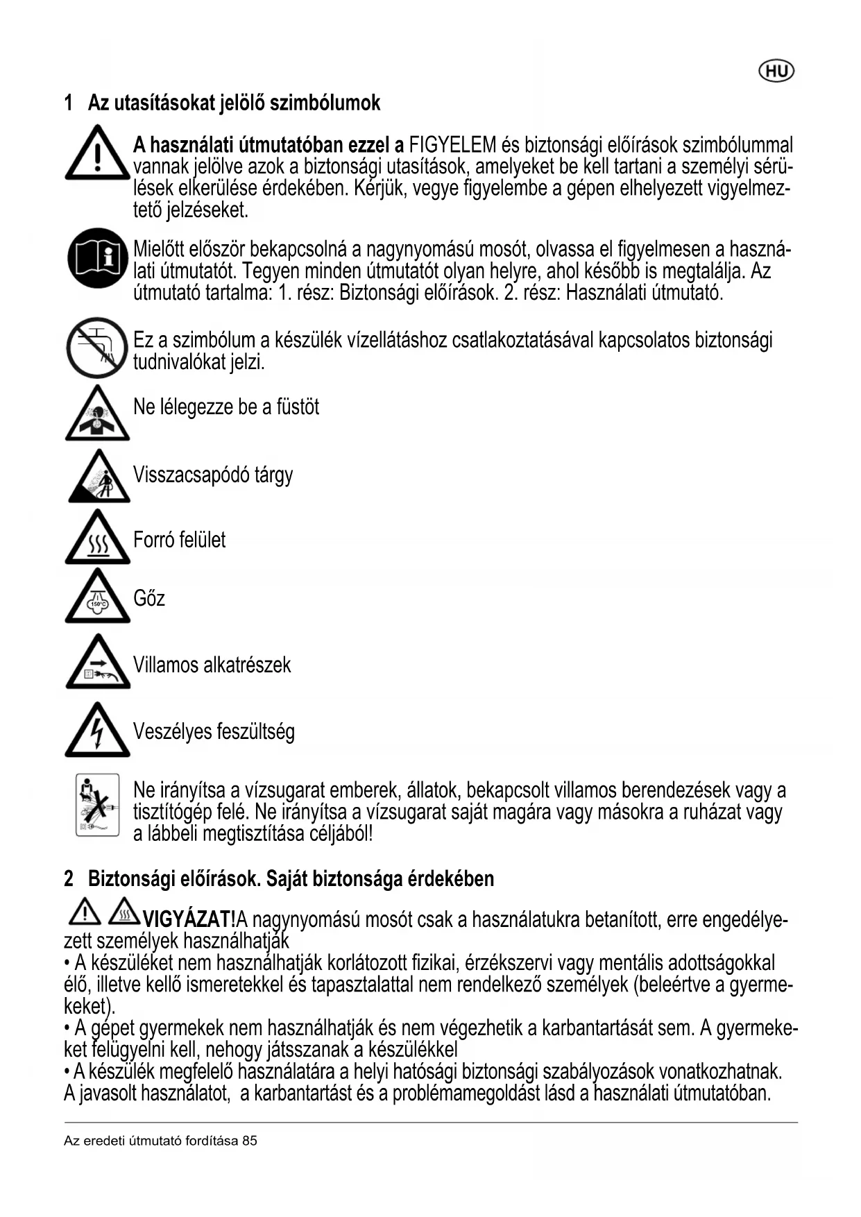- Óvatlanság esetén a nagynyomású vízsugár veszélyes lehet. Ne irányítsa a vízsugarat embe- rek, bekapcsolt villamos berendezések vagy vissza a készülék felé