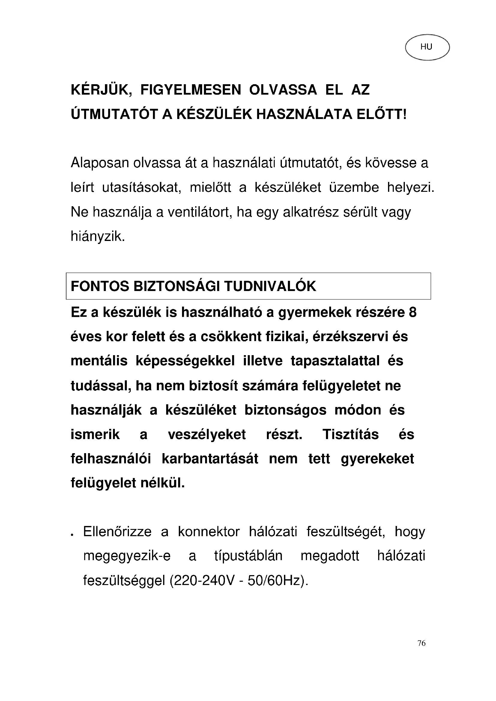 Ez a készülék is használható a gyermekek részére 8 éves kor felett és a csökkent fizikai, érzékszervi és mentális képességekkel illetve tapasztalattal és tudással, ha nem biztosít számára felügyeletet ne használják a készüléket biztonságos módon és ismerik a veszélyeket részt. Tisztítás és felhasználói karbantartását nem tett gyerekeket felügyelet nélkül. Ellenőrizze a konnektor hálózati feszültségét, hogy megegyezik-e a típustáblán megadott hálózati feszültséggel (220-240V - 50/60Hz). HU77 A hálózati kábelt nem szabad letakarni. Olyan helyen csatlakoztassa a készüléket, ahol a hálózati kábelben senki nem botolhat meg. Győződjön meg arról, hogy a készülék használata közben a stabil, vízszintes felületre. Húzza ki a dugót a konnektorból, amikor nem használja a készüléket. Kérjük, ennek során ne a kábelt, hanem a dugót húzza meg. Győződjön meg róla, hogy nincs a ventilátor közelében olyan tárgy, amelyik az oszcilláló mozgást akadályozhatja. Ne dugja az ujját, toll vagy egyéb elemek segítségével a rácson, míg a készülék működik. Ügyeljen rá, hogy ne legyen a készülék mellett függöny, asztalterítő, ruhadarabok, sötétítő függöny, szőrme vagy hasonló. Ezeket a ventilátor beszippanthatja a nyílásába, ami meghibásodást vagy sérüléseket okozhat. Vigye a készüléket működés, ha a kábel vagy a csatlakozó sérült vagy nem működik megfelelően, vagy megsérült bármilyen módon. Ellenőrizze a hálózati kábelt minden használat előtt a78 repedések vagy egyéb kopás, és azt ellenőrizni a készülék, és ha szükséges, cserélje ki a tápkábelt. Kérjük, konzultáljon szakértővel, vagy megfelelően felhatalmazott képviselője. A készülék csak beltéri használatra alkalmas. A készülék, a dugó vagy a kábel nem érintkezhet vízzel vagy vízgőzzel, és nem szabad folyadékokkal lespriccelni. Ne használja a készüléket fürdőszoba, zuhanyzó, úszómedence vagy mosókonyha közelében. Ne tegye ki a készüléket közvetlen napfénynek, vagy ne üzemeltesse ablak mellett. Ne üzemeltesse a készüléket más félvezető fordulatszám-szabályzóval (pl. dimmer kapcsolóval). A ventilátornak üzemelés közben függőlegesen kell állnia, és sohasem szabad az oldalára fektetni. Vegyük a készülék közelében robbanó vagy gyúlékony gázok működik. Húzza ki a dugót a konnektorból, amikor nem használja a készüléket, vagy ha helyet a ventilátor egy másik helyre, vagy távolítsa alkatrészek vagy fix, ha azt szeretnénk, hogy tisztítsa meg a készüléket.79 Soha ne próbálja megjavítani a készüléket. Ha javításra van szükség, kérjük, írjon nekünk a piacon.