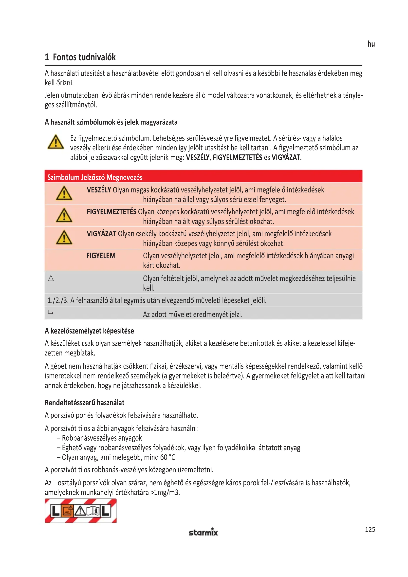 Az L osztalyu porszivok olyan szaraz, nem éghetó és egészségre káros porok fel-/leszivására is hasznalhatók, amelyeknek munkahelyi ertékhatára >1mg / m3
