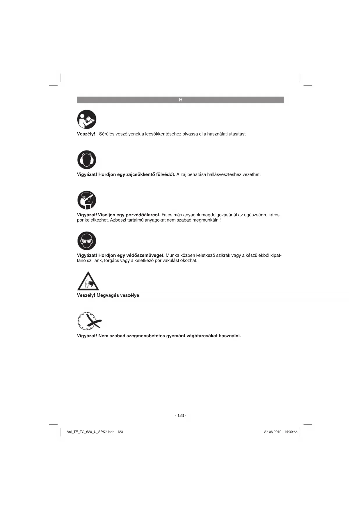 Veszély! - Sérülés veszélyének a lecsökkentéséhez olvassa el a használati utasítást Vigyázat! Hordjon egy zajcsökkentő fülvédőt. A zaj behatása hallásvesztéshez vezethet. Vigyázat! Hordjon egy védőszemüveget. Munka közben keletkező szikrák vagy a készülékből kipat- tanó szillánk, forgács vagy a keletkező por vakulást okozhat. Vigyázat! Viseljen egy porvédőálarcot. Fa és más anyagok megdolgozásánál az egészségre káros por keletkezhet. Azbeszt tartalmú anyagokat nem szabad megmunkálni! Veszély! Megvágás veszélye Vigyázat! Nem szabad szegmensbetétes gyémánt vágótárcsákat használni. Anl_TE_TC_620_U_SPK7.indb 123Anl_TE_TC_620_U_SPK7.indb 123 27.06.2019 14:30:5527.06.2019 14:30:55H
