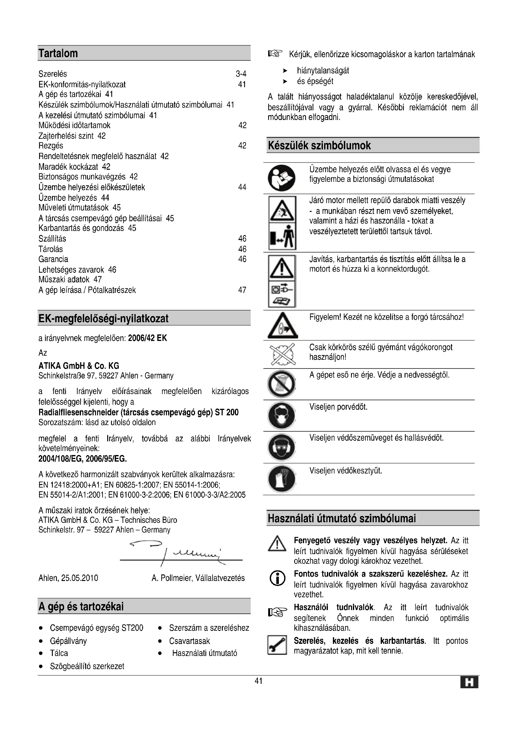 ATIKA GmbH & Co. KG Schinkelstraße 97, 59227 Ahlen - Germany a fenti Irányelv előírásainak megfelelően kizárólagos felelősséggel kijelenti, hogy a Radialfliesenschneider (tárcsás csempevágó gép) ST 200 Sorozatszám: lásd az utolsó oldalon megfelel a fenti Irányelv, továbbá az alábbi Irányelvek követelményeinek: 2004/108/EG, 2006/95/EG. A következő harmonizált szabványok kerültek alkalmazásra: EN 12418:2000+A1; EN 60825-1:2007; EN 55014-1:2006; EN 55014-2/A1:2001; EN 61000-3-2:2006; EN 61000-3-3/A2:2005 A műszaki iratok őrzésének helye: ATIKA GmbH & Co. KG – Technisches Büro Schinkelstr. 97 – 59227 Ahlen – Germany Ahlen, 25.05.2010 A. Pollmeier, Vállalatvezetés