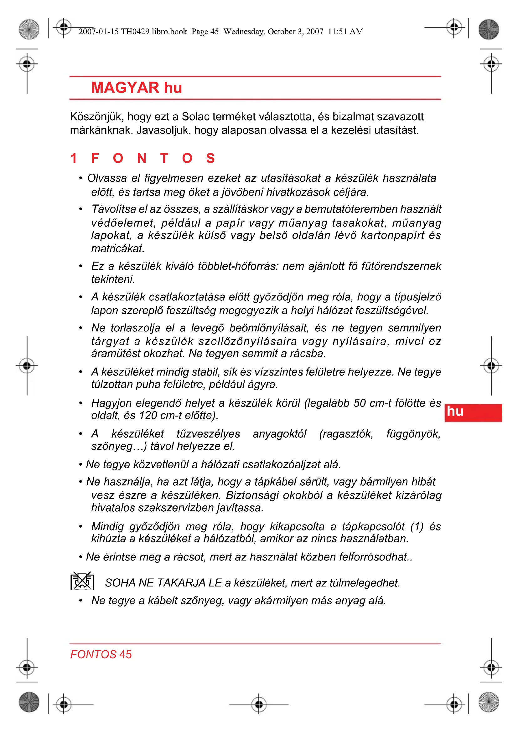 - Ne érintse meg a rácsot, mert az hasznalat kozben felforrosodhat..