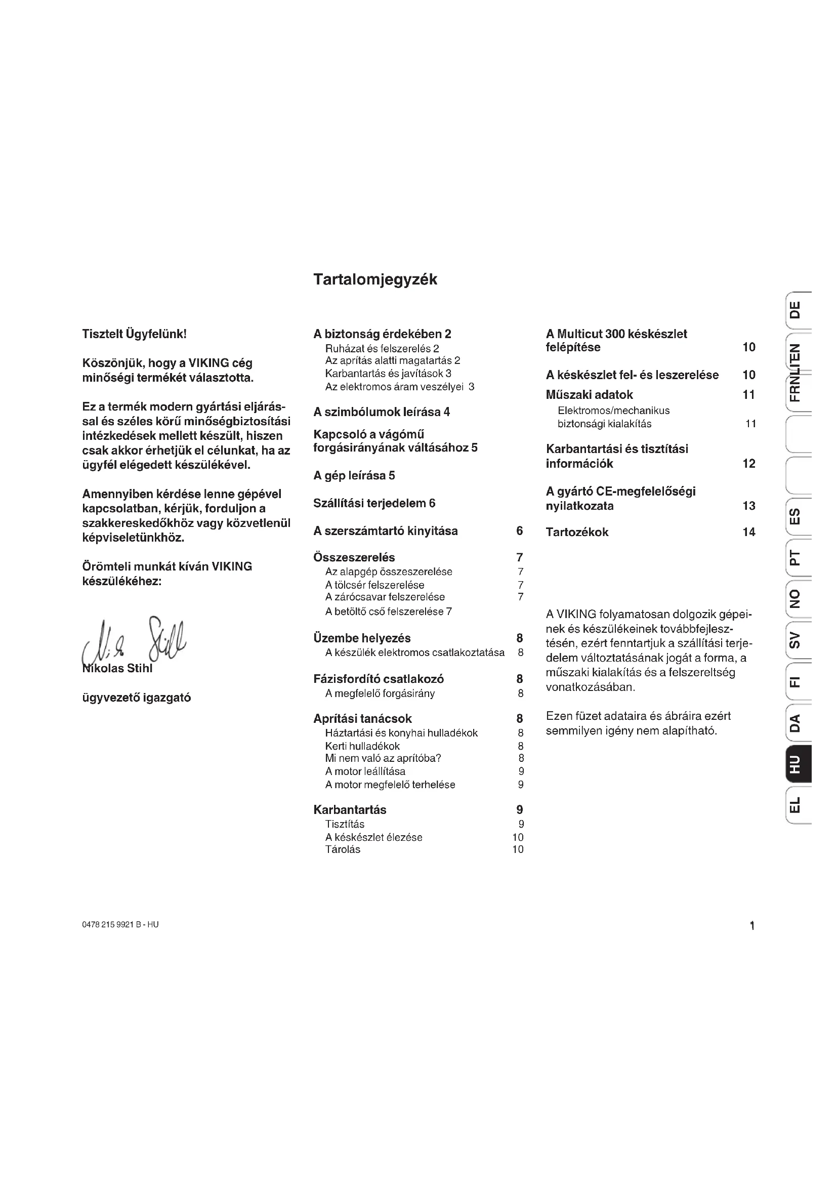 Tisztelt Ügyfelünk! Köszönjük, hogy a VIKING cég minőségi termékét választotta. Ez a termék modern gyártási eljárás- sal és széles körű minőségbiztosítási intézkedések mellett készült, hiszen csak akkor érhetjük el célunkat, ha az ügyfél elégedett készülékével. Amennyiben kérdése lenne gépével kapcsolatban, kérjük, forduljon a szakkereskedőkhöz vagy közvetlenül képviseletünkhöz. Örömteli munkát kíván VIKING készülékéhez: Nikolas Stihl ügyvezető igazgató Tartalomjegyzék A VIKING folyamatosan dolgozik gépei- nek és készülékeinek továbbfejlesz- tésén, ezért fenntartjuk a szállítási terje- delem változtatásának jogát a forma, a műszaki kialakítás és a felszereltség vonatkozásában. Ezen füzet adataira és ábráira ezért semmilyen igény nem alapítható.