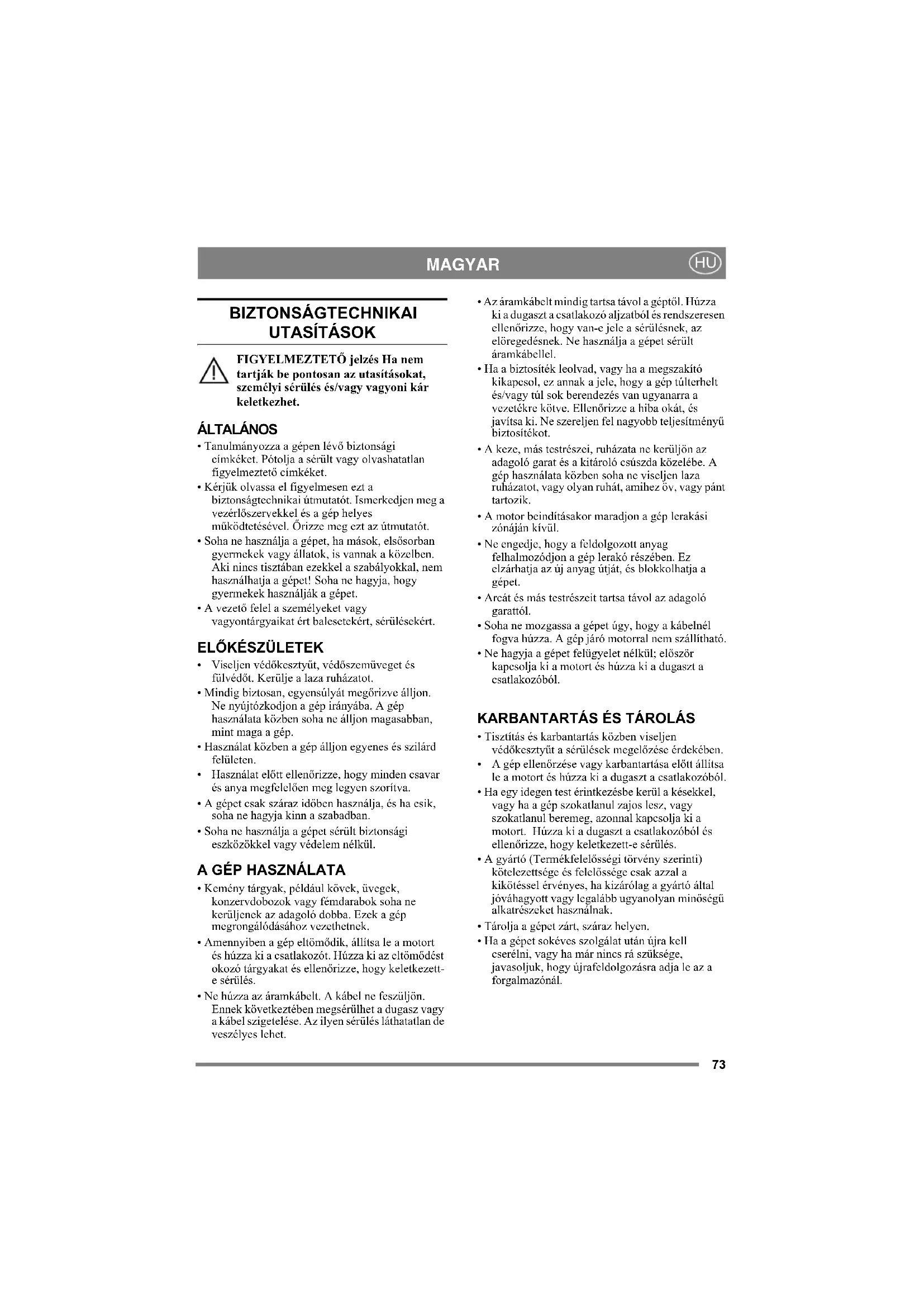 - Soha ne használja a gépet, ha mások, elsősorban gyermekek vagy állatok, is vannak a közelben. Aki nincs tisztában ezekkel a szabályokkal, nem használhatja a gépet! Soha ne hagyja, hogy gyermekek használják a gépet.