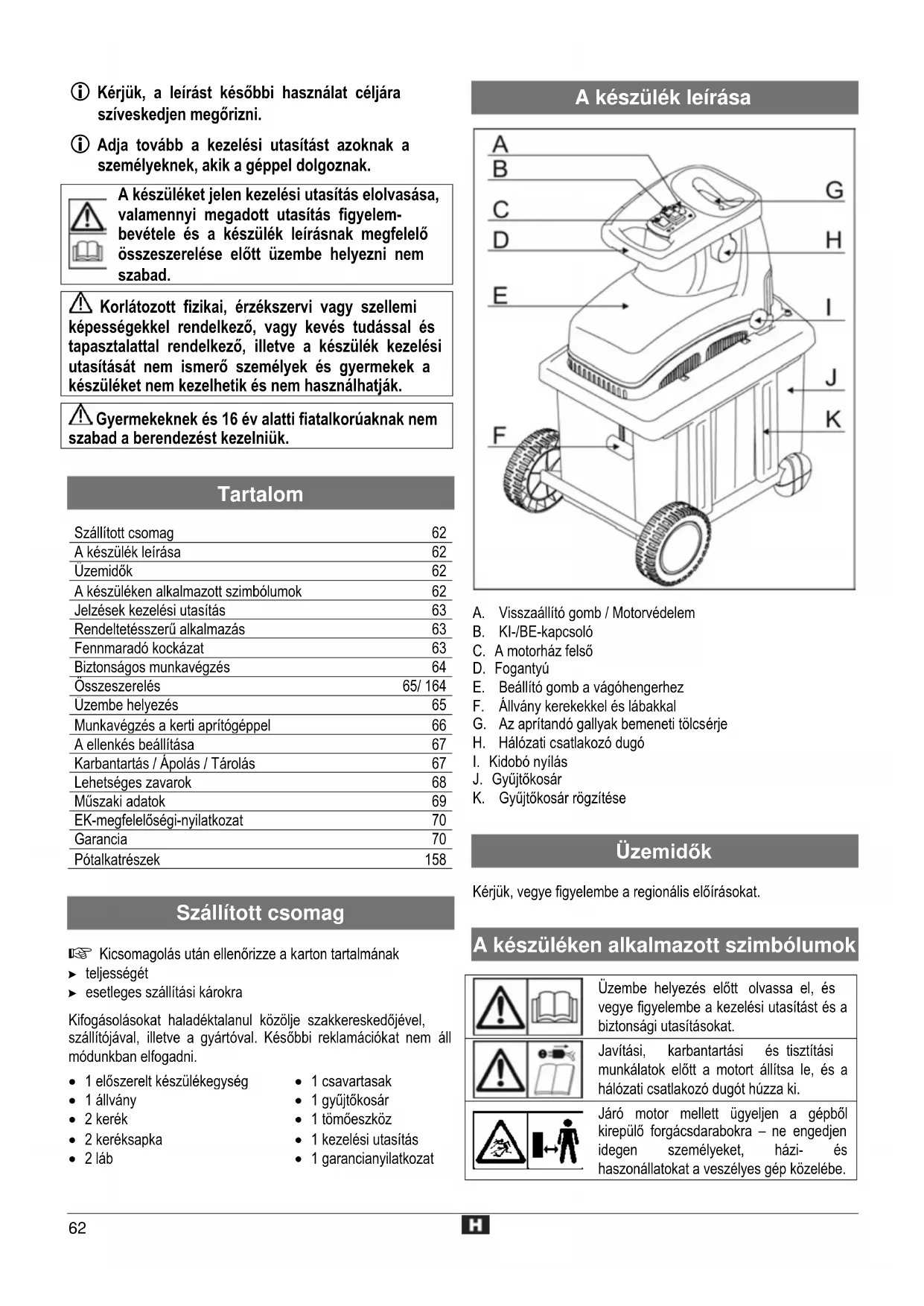 Mielőtt a készülék valamilyen részét megérintené, várjon, míg annak minden része teljesen leállt. Óvakodjék a forgókésektől. járó motor mellett ne nyúljon be se kézzel, se lábbal a berendezés nyílásaiba. Szem- és hallásvédelmet viseljen. Védőkesztyűt viseljen. Nedvességtől védjük. Rálépni nem szabad. Szecskázandó anyag vagdalva Szecskázott anyag nincs vagdalva Gyűjtőkosár rögzítve