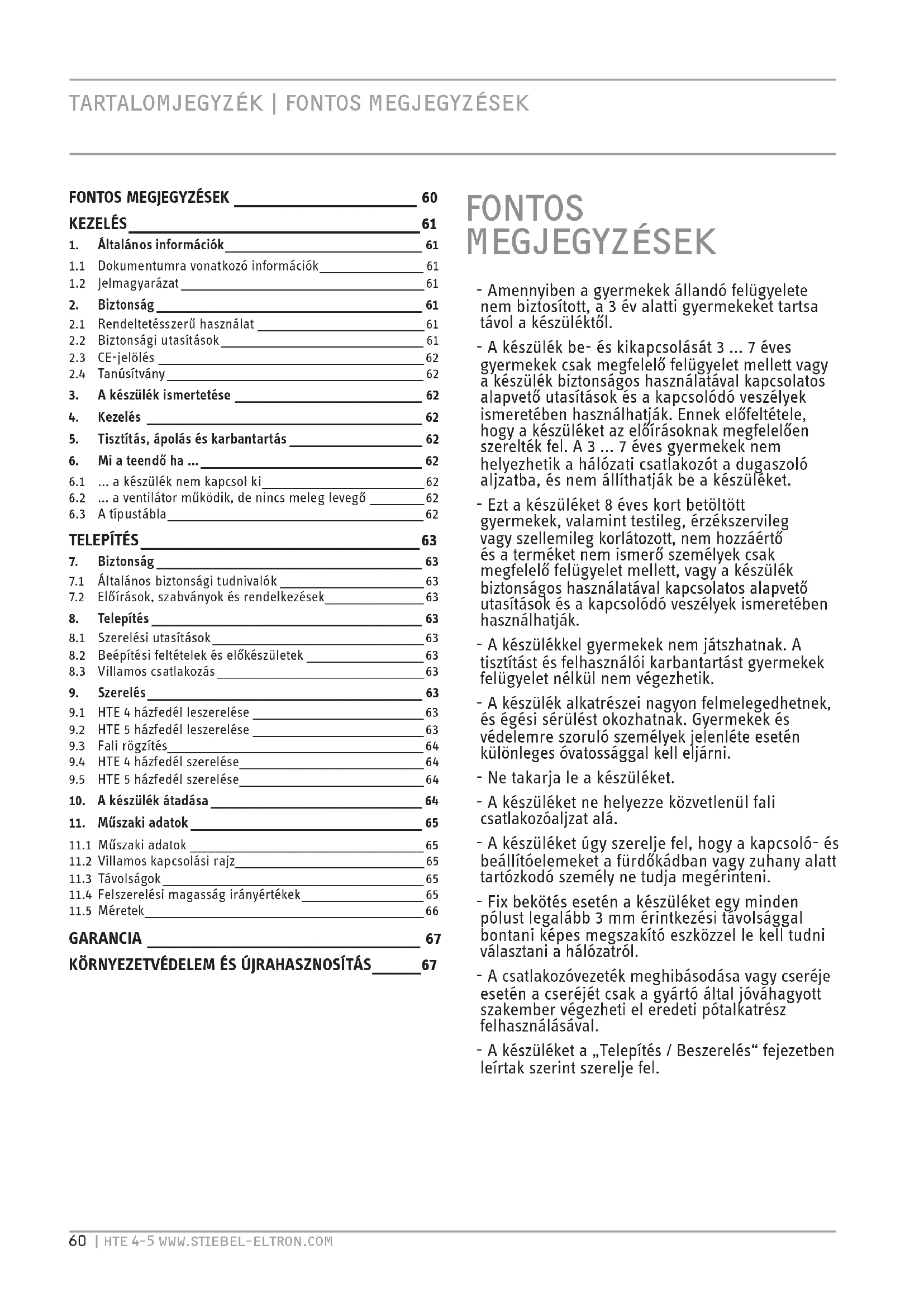 TARTALOMJEGYZéK | FONTOS MEGJEGYZéSEK FONTOS MEGJEGYZéSEK - Amennyiben a gyermekek állandó felügyelete nem biztosított, a 3év alatti gyermekeket tartsa távol a készüléktől. - A készülék be- és kikapcsolását 3...7éves gyermekek csak megfelelő felügyelet mellett vagy a készülék biztonságos használatával kapcsolatos alapvető utasítások és a kapcsolódó veszélyek ismeretében használhatják. Ennek előfeltétele, hogy a készüléket az előírásoknak megfelelően szerelték fel. A 3...7éves gyermekek nem helyezhetik a hálózati csatlakozót a dugaszoló aljzatba, és nem állíthatják be a készüléket. - Ezt a készüléket 8éves kort betöltött gyermekek, valamint testileg, érzékszervileg vagy szellemileg korlátozott, nem hozzáértő és a terméket nem ismerő személyek csak megfelelő felügyelet mellett, vagy a készülék biztonságos használatával kapcsolatos alapvető utasítások és a kapcsolódó veszélyek ismeretében használhatják. - A készülékkel gyermekek nem játszhatnak. A tisztítást és felhasználói karbantartást gyermekek felügyelet nélkül nem végezhetik. - A készülék alkatrészei nagyon felmelegedhetnek, és égési sérülést okozhatnak. Gyermekek és védelemre szoruló személyek jelenléte esetén különleges óvatossággal kell eljárni. - Ne takarja le a készüléket. - A készüléket ne helyezze közvetlenül fali csatlakozóaljzat alá. - A készüléket úgy szerelje fel, hogy a kapcsoló- és beállítóelemeket a fürdőkádban vagy zuhany alatt tartózkodó személy ne tudja megérinteni. - Fix bekötés esetén a készüléket egy minden pólust legalább 3 mm érintkezési távolsággal bontani képes megszakító eszközzel le kell tudni választani a hálózatról. - A csatlakozóvezeték meghibásodása vagy cseréje esetén a cseréjét csak a gyártó által jóváhagyott szakember végezheti el eredeti pótalkatrész felhasználásával. - A készüléket a „Telepítés / Beszerelés“ fejezetben leírtak szerint szerelje fel.