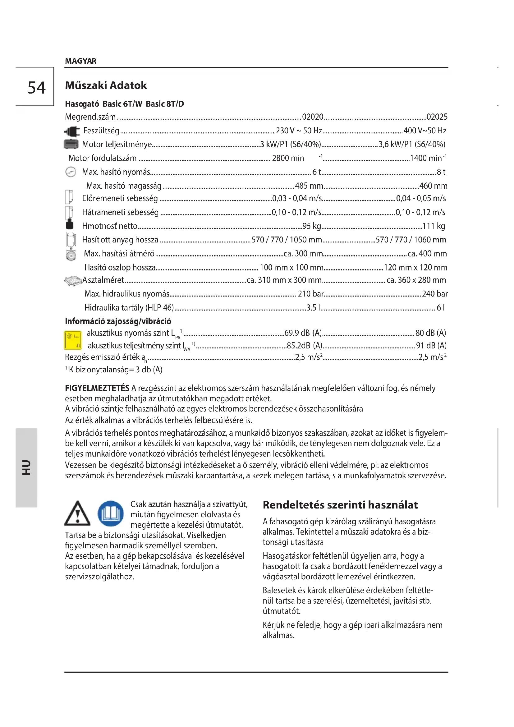A fahasogató gép kizárólag szálirányú hasogatásra alkalmas. Tekintettel a műszaki adatokra és a biztonsági utasításra