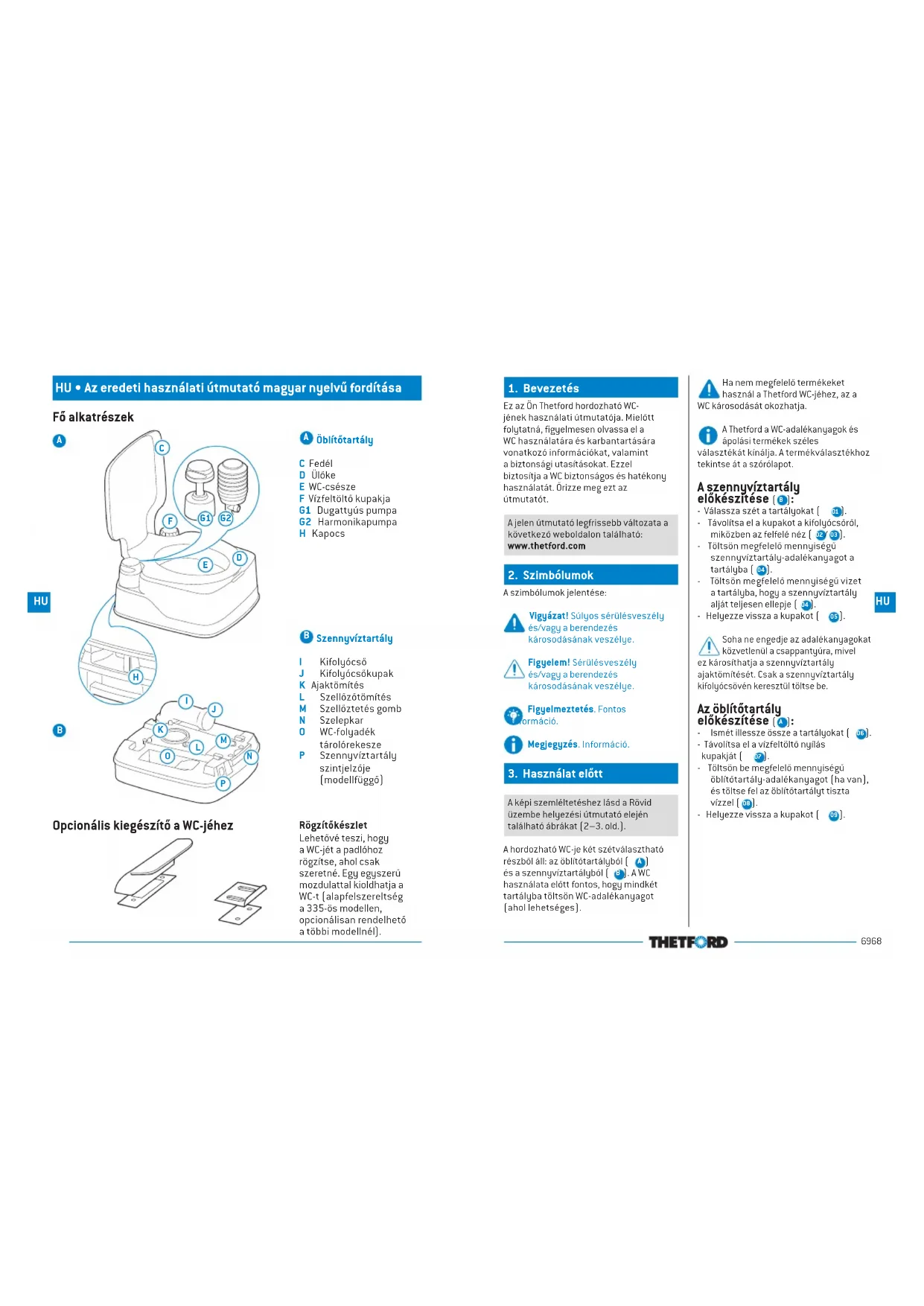 Ez az Ön Thetford hordozható WC-jének használati útmutatója. Mielőtt folytatná, figyelmesen olvassa el a WC használatára és karbantartására vonatkozó információkat, valamint a biztonsági utasításokat. Ezzel biztosítja a WC biztonságos és hatékony használatát. Őrizze meg ezt az útmutatót.A jelen útmutató legfrissebb változata a következő weboldalon található: www.thetford.com