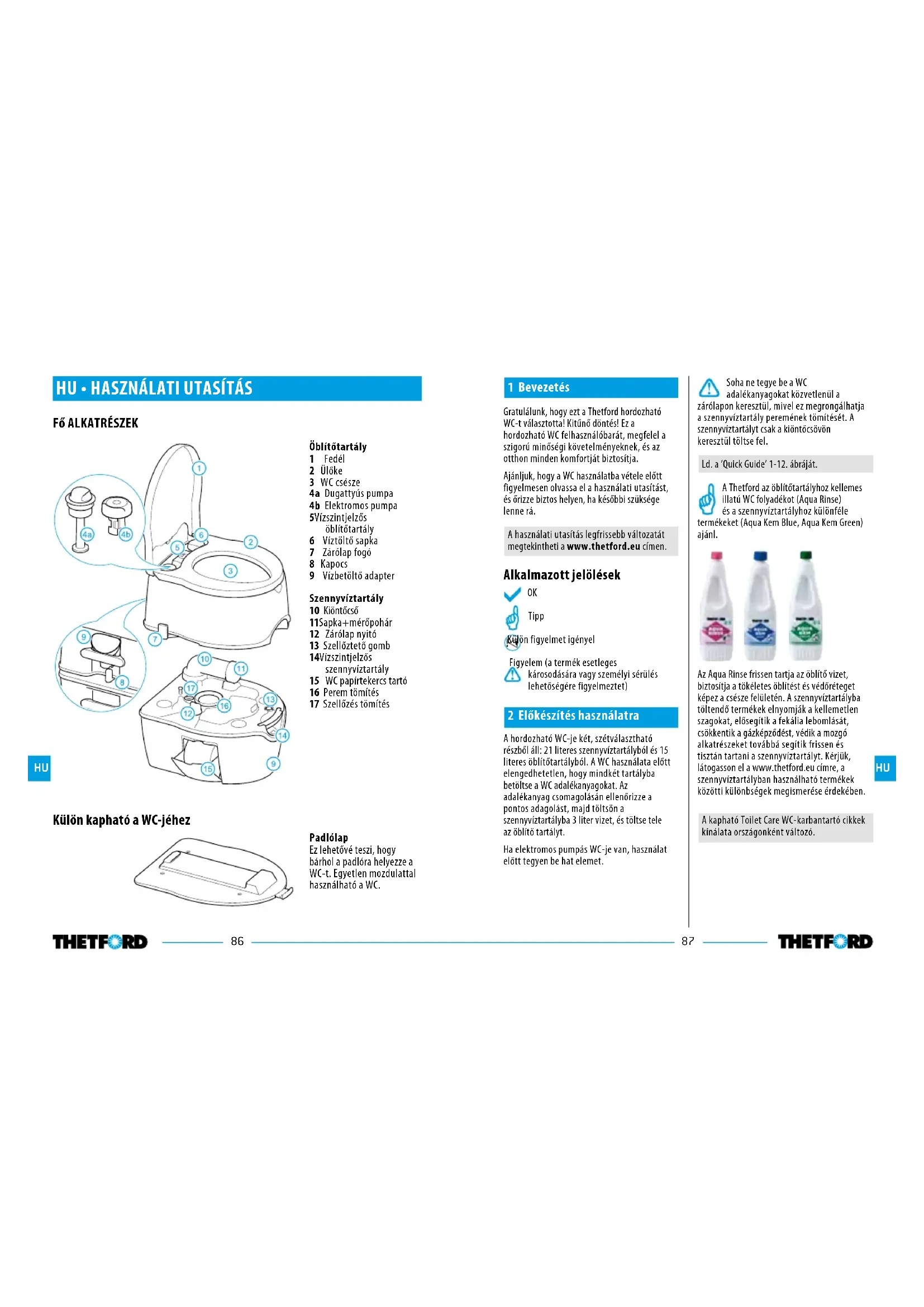 Tipp Külön figyelmet igényel Figyelem (a termék esetleges károsodására vagy személyi sérülés lehetőségére figyelmeztet) 2 Előkészítés használatra A hordozható WC-je két, szétválasztható részből áll: 21 literes szennyvíztartályból és 15 literes öblítőtartályból. A WC használata előtt elengedhetetlen, hogy mindkét tartályba betöltse a WC adalékanyagokat. Az adalékanyag csomagolásán ellenőrizze a pontos adagolást, majd töltsön a szennyvíztartályba 3 liter vizet, és töltse tele az öblítő tartályt. Ha elektromos pumpás WC-je van, használat előtt tegyen be hat elemet.Soha ne tegye be a WC adalékanyagokat közvetlenül a zárólapon keresztül, mivel ez megrongálhatja a szennyvíztartály peremének tömítését. A szennyvíztartályt csak a kiöntőcsövön keresztül töltse fel. Ld. a ’Quick Guide’ 1-12. ábráját.A Thetford az öblítőtartályhoz kellemes illatú WC folyadékot (Aqua Rinse) és a szennyvíztartályhoz különféle termékeket (Aqua Kem Blue, Aqua Kem Green) ajánl. Az Aqua Rinse frissen tartja az öblítő vizet, biztosítja a tökéletes öblítést és védőréteget képez a csésze felületén. A szennyvíztartályba töltendő termékek elnyomják a kellemetlen szagokat, elősegítik a fekália lebomlását, csökkentik a gázképződést, védik a mozgó alkatrészeket továbbá segítik frissen és tisztán tartani a szennyvíztartályt. Kérjük, látogasson el a www.thetford.eu címre, a szennyvíztartályban használható termékek közötti különbségek megismerése érdekében. A kapható Toilet Care WC-karbantartó cikkek kínálata országonként változó. HUHU