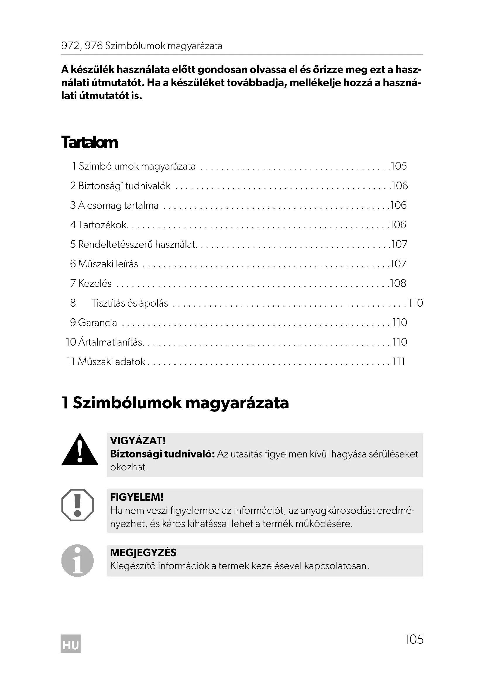 - A készülék használata előtt gondosan olvassa el és őrizze meg ezt a hasz- nálati útmutatót. Ha a készüléket továbbadja, mellékelje hozzá a haszná- lati útmutatót is. Tartalom 1 Szimbólumok magyarázata p. 105