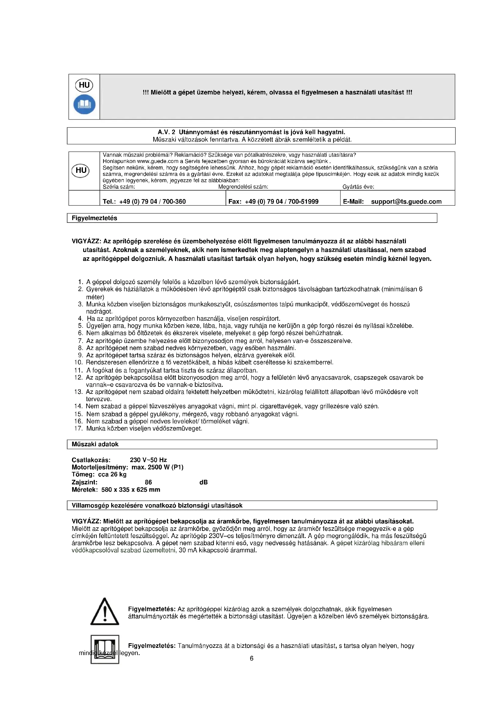 Tel.: +49 (0) 79 04 / 700-360 Fax: +49 (0) 79 04 / 700-51999 E-Mail: support@ts.guede.com Figyelmeztetés VIGYÁZZ: Az aprítógép szerelése és üzembehelyezése előtt figyelmesen tanulmányozza át az alábbi használati utasítást. Azoknak a személyeknek, akik nem ismerkedtek meg alaptengelyn a használati utasítással, nem szabad az aprítógéppel dolgozniuk. A használati utasítást tartsák olyan helyen, hogy szükség esetén mindig kéznél legyen.