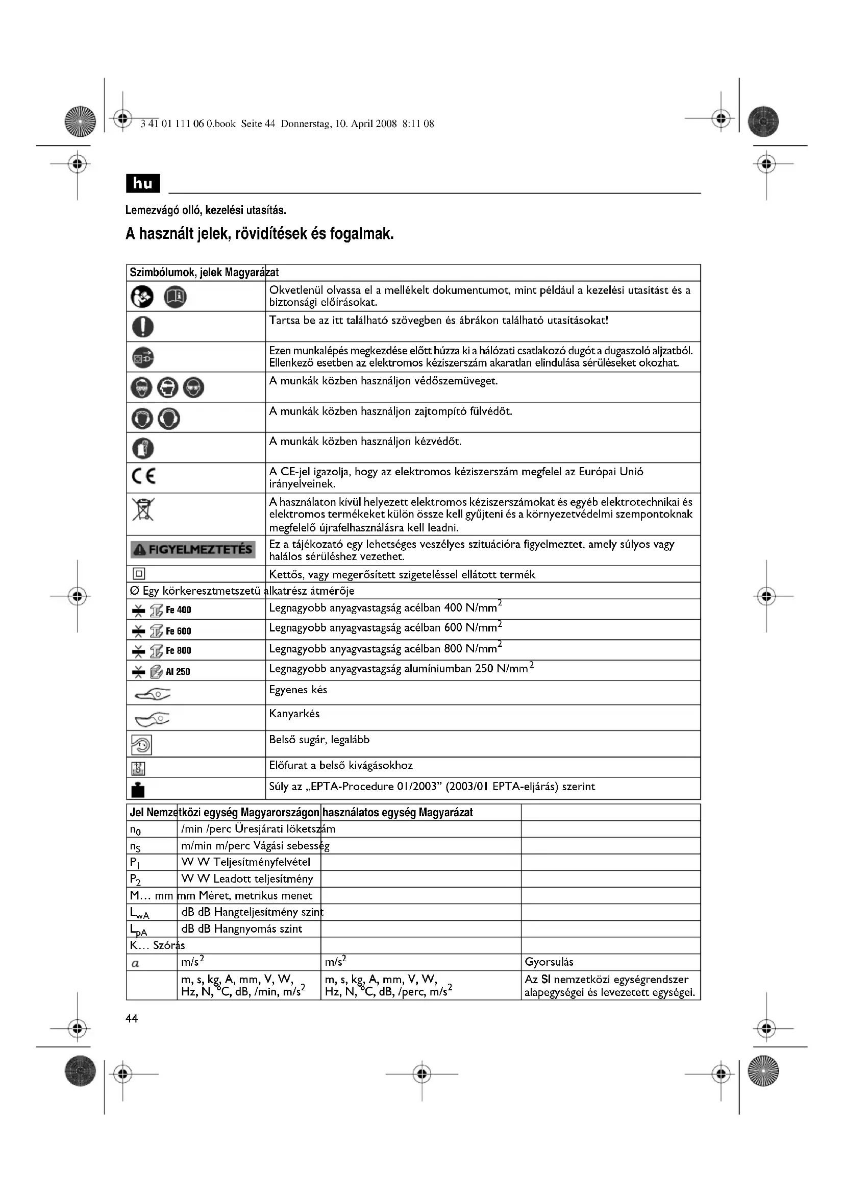 MegfelelŒségi nyilatkozat. A FEIN cég kizárólagos felelősséggel kijelenti, hogy ez a termék megfelel az ezen kezelési utasítás utolsó oldalán megadott normatív dokumentumoknak. Környezetvédelem, hulladékkezelés. A csomagolásokat, a kimustrált elektromos kéziszerszámokat és tartozékokat a környezetvédelmi szempontoknak megfelelően kell újrafelhasználásra. 3 41 01 111 06 0.book Seite 46 Donnerstag, 10. April 2008 8:11 0847