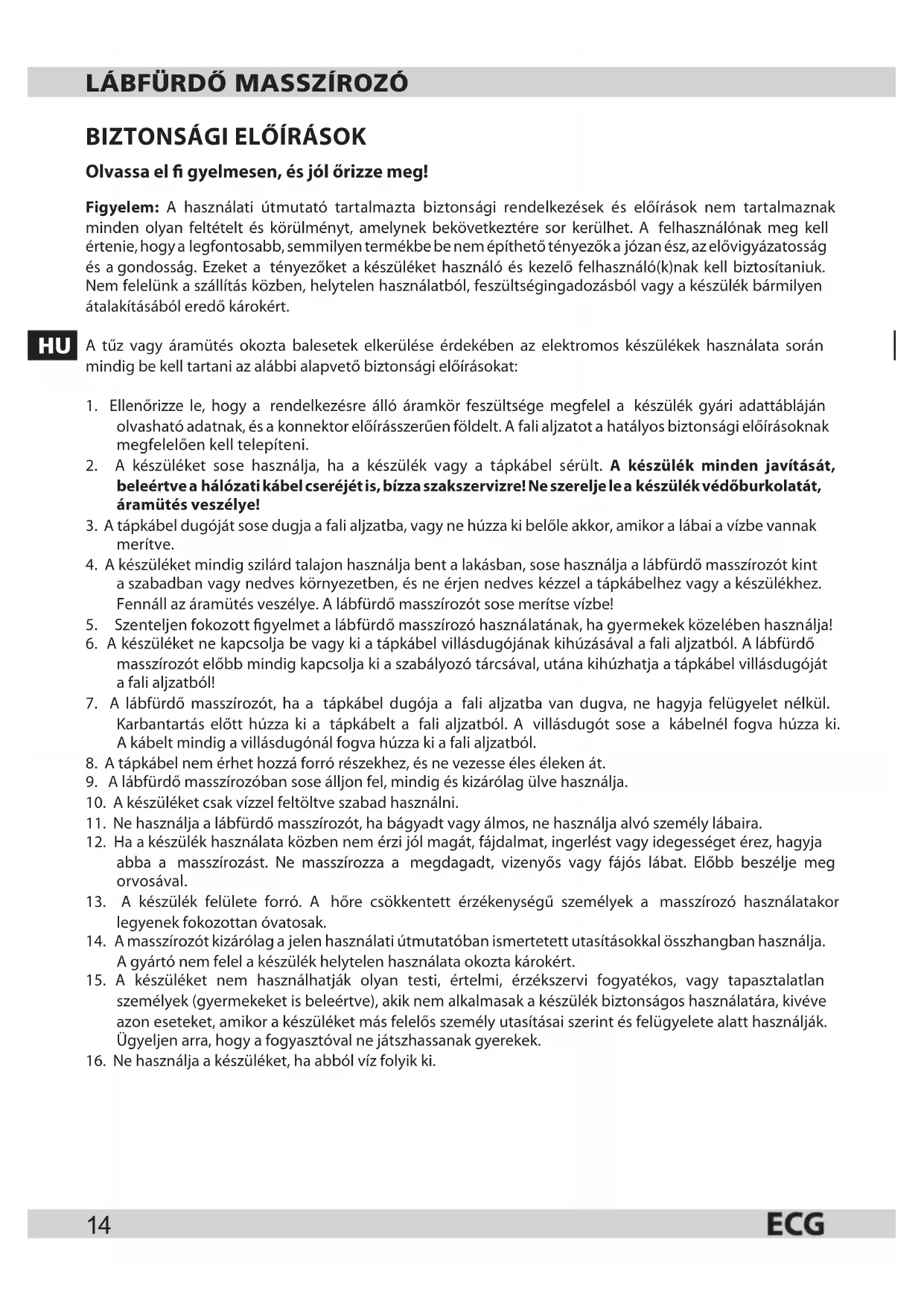 - A keszüléket mindig szilard talaj hasznalja bent a lakásban, sone hasznalja a labfurdo masszirozót hint a szabadban vagy nedves környezetben, és ne érjen nedves kezzel a tapkabelvez vagy a készülékhez. Fennáll az áramütés veszelye. A labfurdo masszirozót sone merítse vizbe!