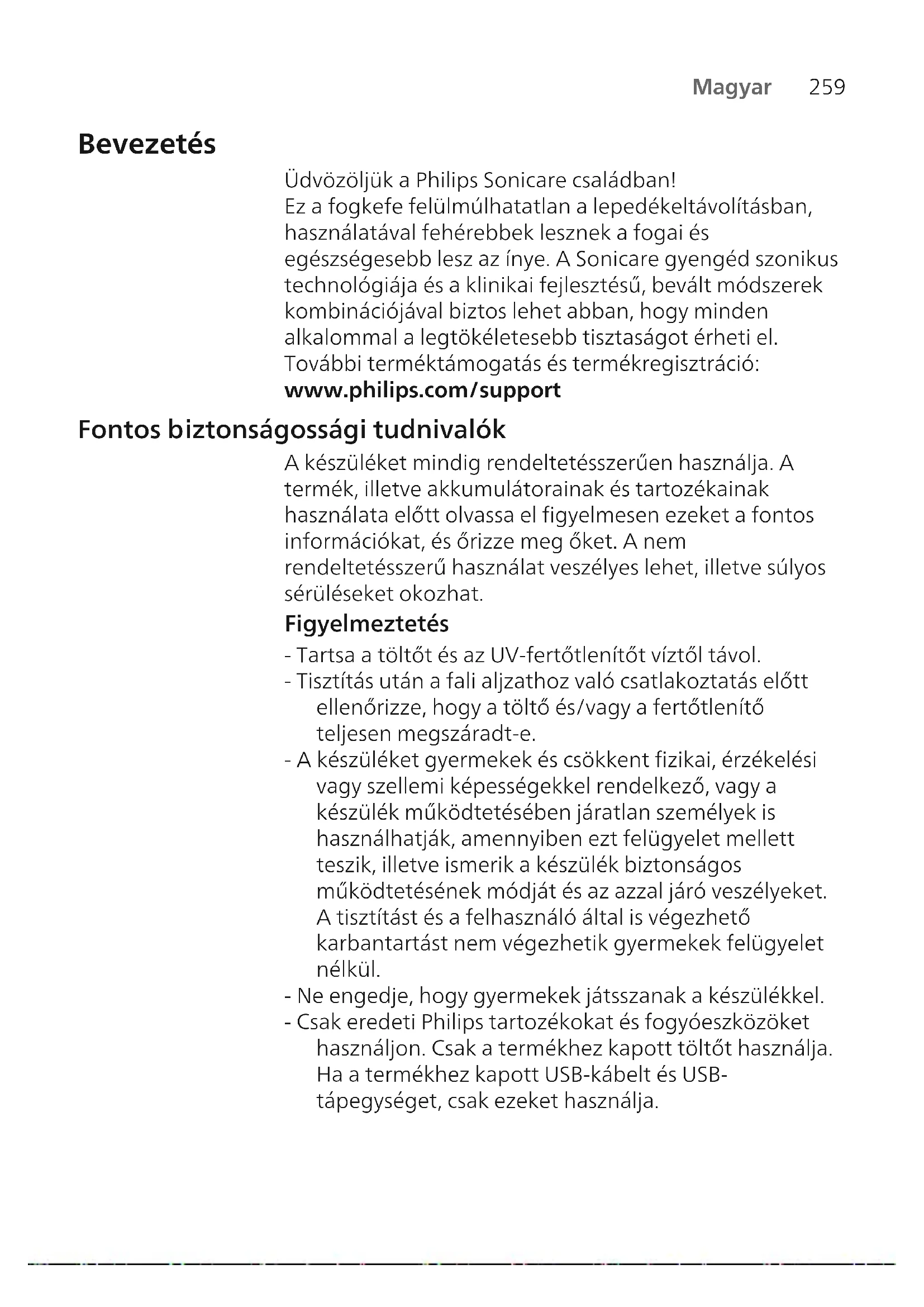 Magyar Bevezetés Üdvözöljük a Philips Sonicare családban! Ez a fogkefe felülmúlhatatlan a lepedékeltávolításban, használatával fehérebbek lesznek a fogai és egészségesebb lesz az ínye. A Sonicare gyengéd szonikus technológiája és a klinikai fejlesztésű, bevált módszerek kombinációjával biztos lehet abban, hogy minden alkalommal a legtökéletesebb tisztaságot érheti el. További terméktámogatás és termékregisztráció: www.philips.com/support Fontos biztonságossági tudnivalók A készüléket mindig rendeltetésszerűen használja. A termék, illetve akkumulátorainak és tartozékainak használata előtt olvassa el figyelmesen ezeket a fontos információkat, és őrizze meg őket. A nem rendeltetésszerű használat veszélyes lehet, illetve súlyos sérüléseket okozhat. Figyelmeztetés - Tartsa a töltőt és az UV-fertőtlenítőt víztől távol. - Tisztítás után a fali aljzathoz való csatlakoztatás előtt ellenőrizze, hogy a töltő és/vagy a fertőtlenítő teljesen megszáradt-e. - A készüléket gyermekek és csökkent fizikai, érzékelési vagy szellemi képességekkel rendelkező, vagy a készülék működtetésében járatlan személyek is használhatják, amennyiben ezt felügyelet mellett teszik, illetve ismerik a készülék biztonságos működtetésének módját és az azzal járó veszélyeket. A tisztítást és a felhasználó által is végezhető karbantartást nem végezhetik gyermekek felügyelet nélkül. - Ne engedje, hogy gyermekek játsszanak a készülékkel. - Csak eredeti Philips tartozékokat és fogyóeszközöket használjon. Csak a termékhez kapott töltőt használja. Ha a termékhez kapott USB-kábelt és USB- tápegységet, csak ezeket használja.260 Magyar - A készülék nem tartalmaz a felhasználó által javítható alkatrészt. Ha a készülék meghibásodott, ne használja tovább, hanem lépjen kapcsolatba az országában illetékes ügyfélszolgálattal. Csak vezetékes eszközök esetén: Ha megsérül a vezeték, cserélje ki a töltőt a fertőtlenítővel egy újra. - Nehasználja a töltőt és/vagy a fertőtlenítőt kültéri helyeken vagy felmelegedett felületek közelében. - A készülék alkatrészeit ne tisztítsa mosogatógépben. - A készüléket kizárólag a fogak, az íny és a nyelv tisztítására terveztük. - A készüléket és a vezetéket mindig tartsa gyermekektől távol. - Ne használja tovább a fertőtlenítőt, ha az UV-fény nyitott rekeszfedél mellett is világít. Az UV-fény károsíthatja a szemet és a bőrt. - A fertőtlenítő egységet csak felhelyezett védőszűrővel működtesse. - Ne érjen az UV-fertőtlenítő egység UV-lámpájához, amikor forró. - Ne használja tovább a fogkefefejet, ha a sörték töröttek vagy hajlottak. 3 havonta cserélje a fogkefefejet,illetve ha kopás jelei mutatkoznak, akkor hamarabb cserélje. - Ne használja illóolajat vagy kókuszolajat tartalmazó termékekkel. Az ilyen termékekkel való érintkezés a sörték kihullásához vezethet. - Ha a készülék használata után túlzott vérzés jelentkezik, vagy ha a vérzés egyheti használat után sem szűnik, illetve ha kellemetlen érzést vagy fájdalmat tapasztal, hagyja abba a használatát, és forduljon fogorvoshoz vagy orvoshoz. - Ha az elmúlt 2 hónapban szájsebészeti műtétje volt, kérje ki fogorvosa tanácsát, mielőtt a készüléket használná. - Ha szívritmusszabályozója vagy egyéb beépített gyógyászati eszköze van, használat előtt forduljon a kezelőorvosához vagy a gyógyászati eszköz gyártójához. - Ha egészségügyi aggálya merül fel, a készülék használata előtt forduljon orvosához.261 Magyar - A készülék a személyes higiénia fenntartásának eszköze. Ne használja több különböző páciensnél fogászati gyakorlatban vagy fogászati intézményben. Elemekre és akkumulátorokra vonatkozó biztonsági utasítások - Ez a készülék olyan akkumulátorokat tartalmaz, amelyeket csak szakképzett személyek távolíthatnak el. - A készüléket mindig rendeltetésszerűen használja. A termék, illetve akkumulátorainak és tartozékainak használata előtt olvassa el figyelmesen ezeket az információkat, és őrizze meg őket. A nem rendeltetésszerű használat veszélyes lehet, illetve súlyos sérüléseket okozhat. A különböző termékekkel szállított tartozékok eltérhetnek. - Csak eredeti Philips tartozékokat és fogyóeszközöket használjon. Csak a TCBxxxx, HX6100, HX6110, HX6160 vagy WAAxxxx leválasztható tápegységeket használja. - Ne dobja tűzbe se a terméket, se az akkumulátort, és ne tegye ki őket közvetlen napfénynek vagy magas hőmérsékletnek. - Ha a termék abnormálisan felforrósodik, szokatlan szagot bocsát ki, vagy ha a töltés a szokásosnál sokkal hosszabb ideig tart, akkor ne használja és ne töltse tovább, hanem forduljon a Philips helyi szaküzletéhez. - Ne tegye a termékeket vagy az elemet/akkumulátort mikrohullámú sütőbe vagy indukciós főzőlapokra. - Az akkumulátor felmelegedésének, valamint a mérgező vagy veszélyes anyagok felszabadulásának megakadályozása érdekében ne nyissa fel, ne módosítsa, ne szúrja át és ne rongálja meg a terméket vagy az akkumulátort. Ne töltse, ne zárja rövidre és ne töltse fordított polaritással az elemeket. - A készülék a felhasználó által nem cserélhető elemet tartalmaz. Az akkumulátor élettartamának végén a készüléket megfelelően kell a hulladékba helyezni – ezzel kapcsolatban tekintse meg az újrahasznosítással kapcsolatos részt.262 Magyar - Ha az elem/akkumulátor sérült vagy szivárog, kerülje a bőrrel vagy szemmel való érintkezést. Ha ez mégis megtörténik, azonnal öblítse le bő vízzel, és forduljon orvoshoz. - Az elemek/akkumulátorok használatakor ügyeljen arra, hogy a keze, a termék és az elemek/akkumulátorok szárazak legyenek. - A