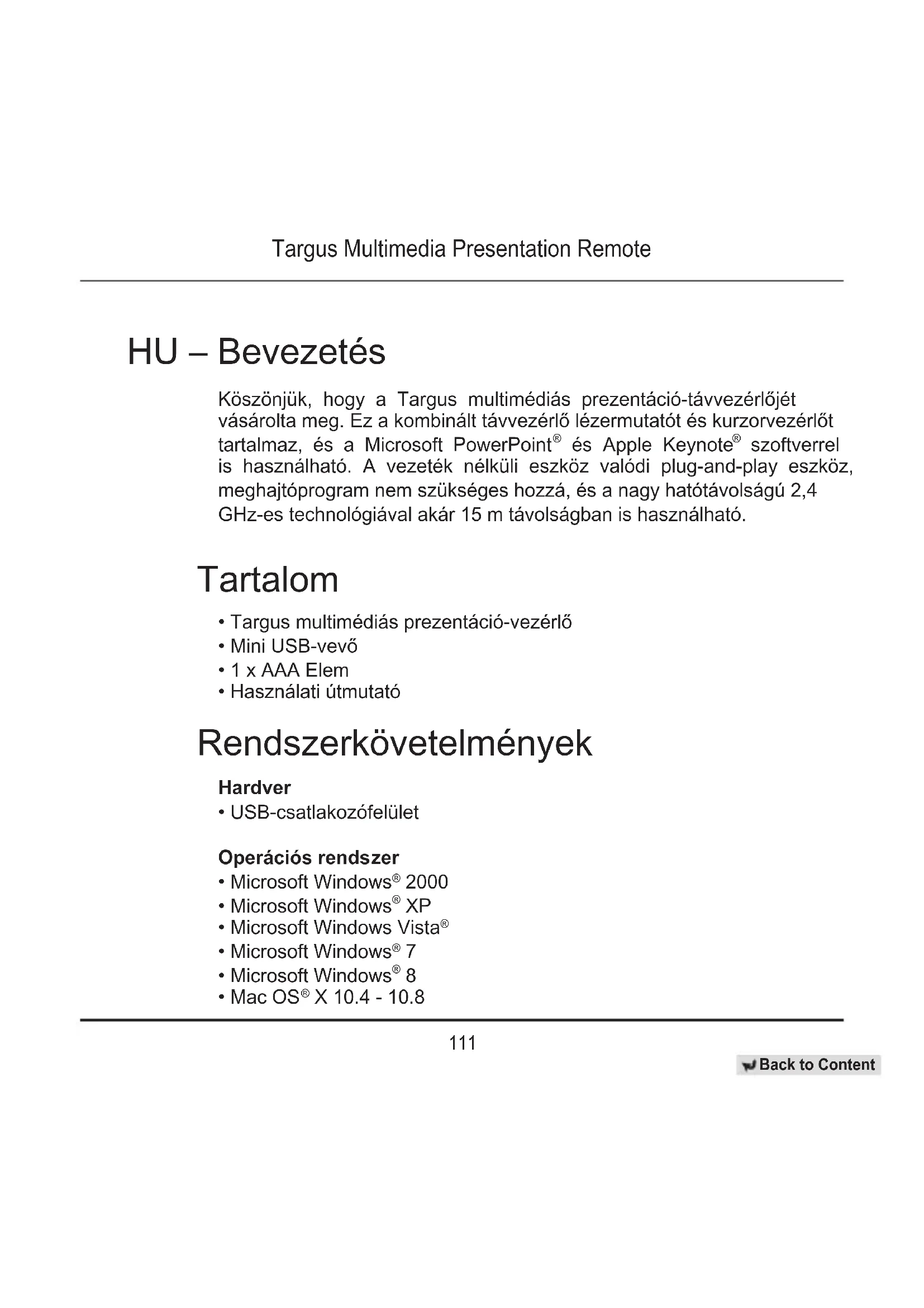 X 10.4 - 10.8 HU – Bevezetés Köszönjük, hogy a Targus multimédiás prezentáció-távvezérlőjét vásárolta meg. Ez a kombinált távvezérlő lézermutatót és kurzorvezérlőt tartalmaz, és a Microsoft PowerPoint