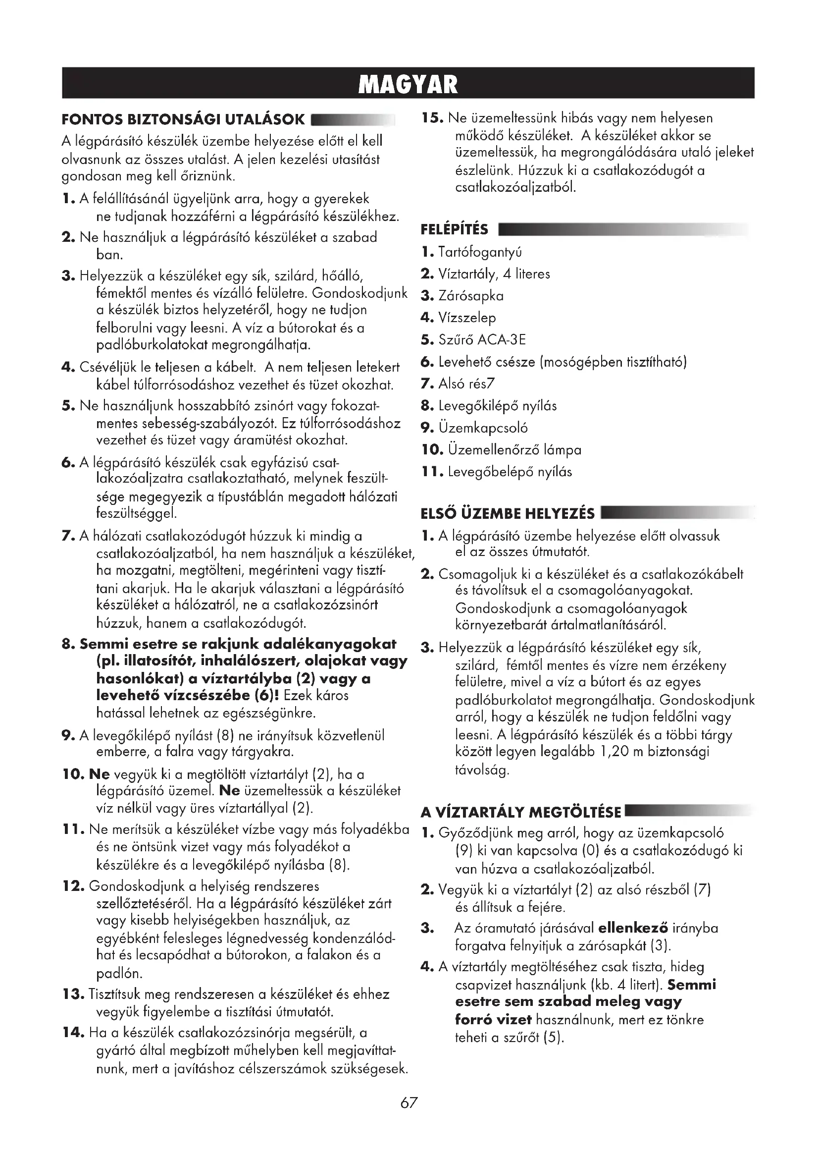 A légpárásító készülék üzembe helyezése előtt el kell olvasnunk az összes utalást. A jelen kezelési utasítást gondosan meg kell őriznünk.