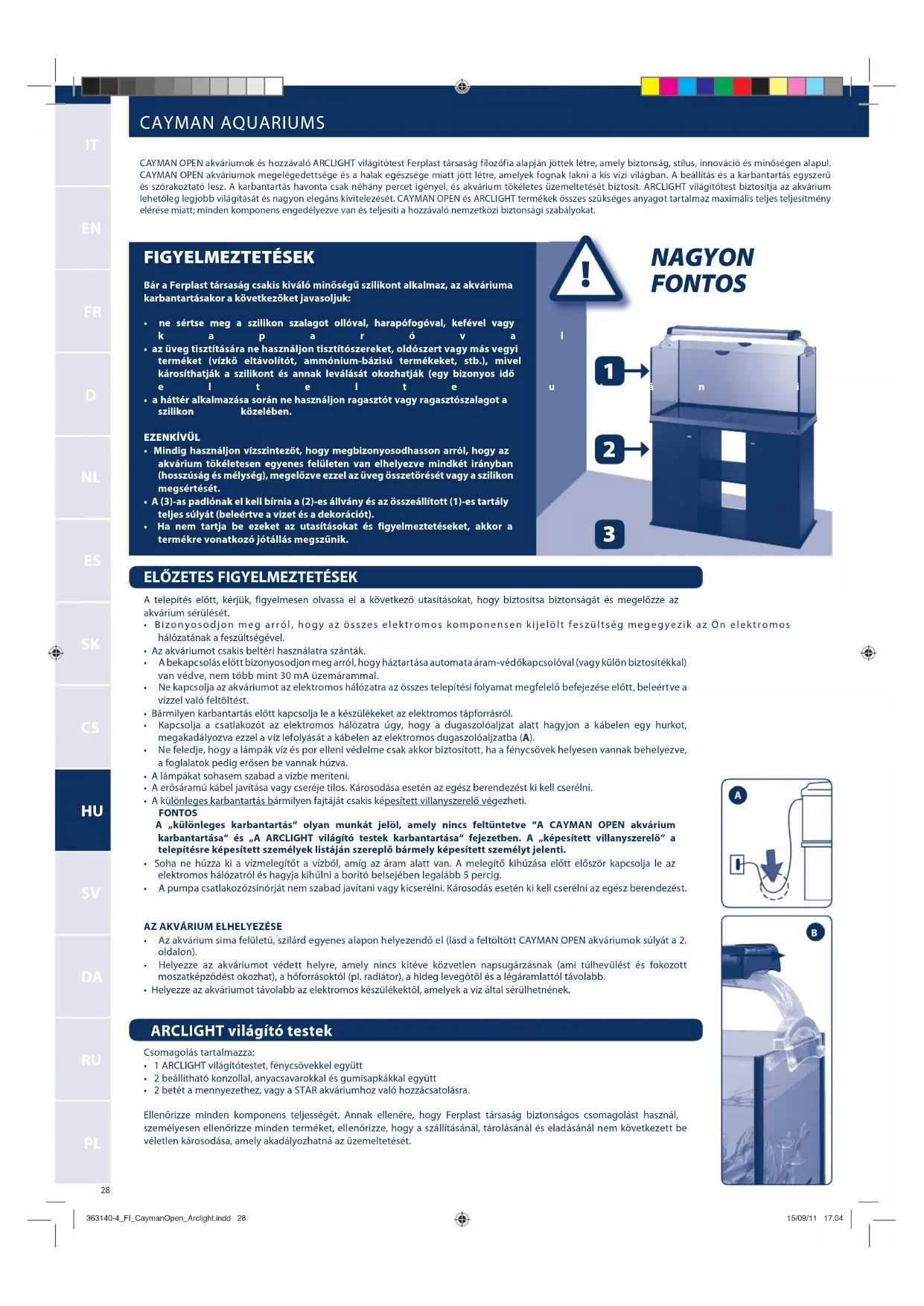 - Ne feledje, hogy a lámpák víz és por elleni védelme csak akkor biztosított, ha a fénycsövek helyesen vannak behelyezve, a foglalatok pedig erősen be vannak húzva.• A lámpákat sohasem szabad a vízbe meríteni.• A erősáramú kábel javítása vagy cseréje tilos. Károsodása esetén az egész berendezést ki kell cserélni.• A különleges karbantartás bármilyen fajtáját csakis képesített villanyszerelő végezheti. FONTOS A „különleges karbantartás“ olyan munkát jelöl, amely nincs feltüntetve “A CAYMAN OPEN akvárium karbantartása“ és „A ARCLIGHT világító testek karbantartása“ fejezetben. A „képesített villanyszerelő“ a telepítésre képesített személyek listáján szereplő bármely képesített személyt jelenti. • Soha ne húzza ki a vízmelegítőt a vízből, amíg az áram alatt van. A melegítő kihúzása előtt először kapcsolja le az elektromos hálózatról és hagyja kihűlni a borító belsejében legalább 5 percig.