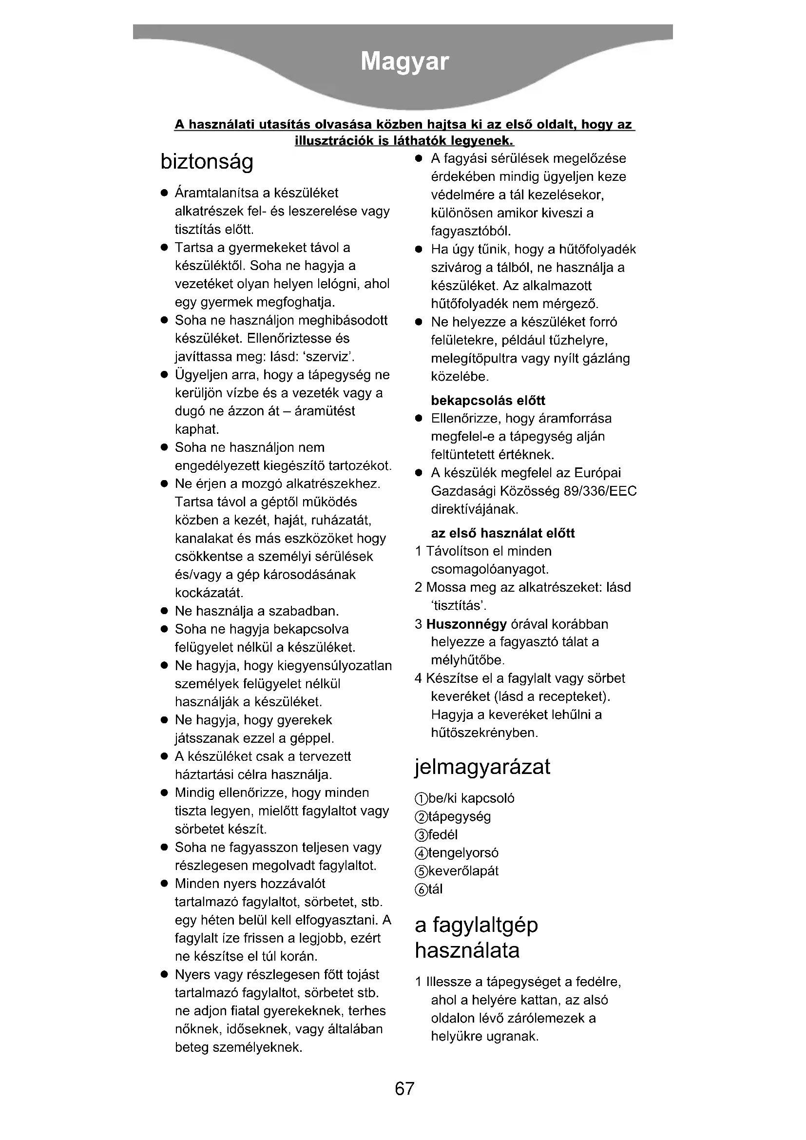 szerviz vagy javítás céljából Forduljon az üzlethez, ahol a készüléket vásárolta. receptek banán fagylalt 2 érett banán 200ml félig fölözött tej 100ml dupla tejszín 50g porcukor Törje össze sima péppé a banánt. Keverje össze a tejet, dupla tejszínt és a cukrot. Öntse a tálba a keverőlapát működése közben. Hagyja hűlni a megfelelő állag eléréséig. joghurtos eper fagylalt 200g friss eper, felolvasztva, ha mélyhűtött 75g porcukor 250ml natúr joghurt Törje össze vagy pépesítse az epret. A simább végtermék érdekében távolítsa el a magokat szitával. Adja hozzá a cukrot és a natúr joghurtot és keverje össze. Öntse a keveréket a fagyasztó tálba a keverőlapát működése közben. Hagyja hűlni a megfelelő állag eléréséig. csokoládés mentás fagylalt 225ml félig fölözött tej 50g porcukor 225ml dupla tejszín pár csepp menta eszencia 75g reszelt csokoládé Helyezze a tejet és a cukrot egy lábasba. Melegítse kis lángon és kevergesse, amíg a cukor felolvad, majd hagyja lehűlni. Keverje a tejszínt és a menta eszenciát a lehűlt tejhez. Öntse a keveréket a fagyasztó tálba a keverőlapát működése közben. Szórja be a nyíláson a reszelt csokoládét, amikor a keverék fagyni kezd. Hagyja hűlni a megfelelő állag eléréséig. 69eper fagylalt 350g friss eper 75g porcukor 200ml dupla tejszín