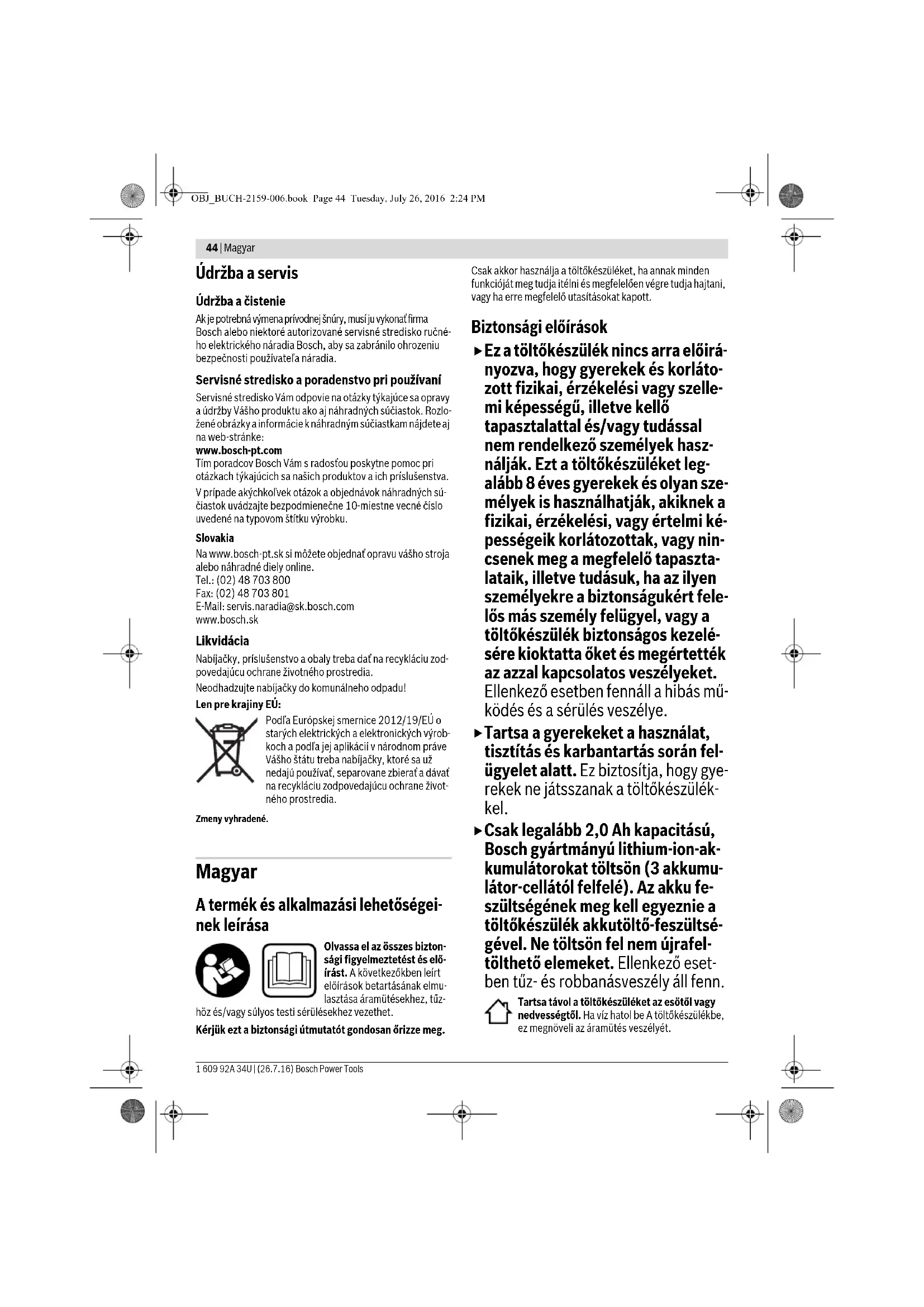 Na nabíjacej ploche leží iný/ ďalší predmet ako akumulá- tor Odstráňte predmet Umiestnený nesprávny aku- mulátor Umiestnite kompatibilný aku- mulátor Akumulátor je pokazený Akumulátor vymeniť za nový Indikácia pohotovostného stavu (zelená) 2 nesvieti Zástrčka nabíjačky nie je (nie je správne) zasunutá do zá- suvky Zástrčku zasuňte do zásuvky (zasuňte ju celkom) Zásuvka, sieťová šnúra alebo nabíjačka je poškodená Skontrolujte sieťové napätie, nabíjačku dajte prípadne pre- skúšať v autorizovanej servis- nej opravovni ručného elek- trického náradia Bosch OBJ_BUCH-2159-006.book Page 43 Tuesday, July 26, 2016 2:24 PM44 | Magyar 1 609 92A 34U | (26.7.16) Bosch Power Tools Údržba a servis Údržba a čistenie Ak je potrebná výmena prívodnej šnúry, musí ju vykonať firma Bosch alebo niektoré autorizované servisné stredisko ručné- ho elektrického náradia Bosch, aby sa zabránilo ohrozeniu bezpečnosti používateľa náradia. Servisné stredisko a poradenstvo pri používaní Servisné stredisko Vám odpovie na otázky týkajúce sa opravy a údržby Vášho produktu ako aj náhradných súčiastok. Rozlo- žené obrázky a informácie k náhradným súčiastkam nájdete aj na web-stránke: www.bosch-pt.com Tím poradcov Bosch Vám s radosťou poskytne pomoc pri otázkach týkajúcich sa našich produktov a ich príslušenstva. V prípade akýchkoľvek otázok a objednávok náhradných sú- čiastok uvádzajte bezpodmienečne 10-miestne vecné číslo uvedené na typovom štítku výrobku. Slovakia Na www.bosch-pt.sk si môžete objednať opravu vášho stroja alebo náhradné diely online. Tel.: (02) 48 703 800 Fax: (02) 48 703 801 E-Mail: servis.naradia@sk.bosch.com www.bosch.sk Likvidácia Nabíjačky, príslušenstvo a obaly treba dať na recykláciu zod- povedajúcu ochrane životného prostredia. Neodhadzujte nabíjačky do komunálneho odpadu! Len pre krajiny EÚ: Podľa Európskej smernice 2012/19/EÚ o starých elektrických a elektronických výrob- koch a podľa jej aplikácií v národnom práve Vášho štátu treba nabíjačky, ktoré sa už nedajú používať, separovane zbierať a dávať na recykláciu zodpovedajúcu ochrane život- ného prostredia. Zmeny vyhradené. Magyar A termék és alkalmazási lehetőségei- nek leírása Olvassa el az összes bizton- sági figyelmeztetést és elő- írást. A következőkben leírt előírások betartásának elmu- lasztása áramütésekhez, tűz- höz és/vagy súlyos testi sérülésekhez vezethet. Kérjük ezt a biztonsági útmutatót gondosan őrizze meg. Csak akkor használja a töltőkészüléket, ha annak minden funkcióját meg tudja itélni és megfelelően végre tudja hajtani, vagy ha erre megfelelő utasításokat kapott. Biztonsági előírások Ez a töltőkészülék nincs arra előirá- nyozva, hogy gyerekek és korláto- zott fizikai, érzékelési vagy szelle- mi képességű, illetve kellő tapasztalattal és/vagy tudással nem rendelkező személyek hasz- nálják. Ezt a töltőkészüléket leg- alább 8 éves gyerekek és olyan sze- mélyek is használhatják, akiknek a fizikai, érzékelési, vagy értelmi ké- pességeik korlátozottak, vagy nin- csenek meg a megfelelő tapaszta- lataik, illetve tudásuk, ha az ilyen személyekre a biztonságukért fele- lős más személy felügyel, vagy a töltőkészülék biztonságos kezelé- sére kioktatta őket és megértették az azzal kapcsolatos veszélyeket. Ellenkező esetben fennáll a hibás mű- ködés és a sérülés veszélye. Tartsa a gyerekeket a használat, tisztítás és karbantartás során fel- ügyelet alatt. Ez biztosítja, hogy gye- rekek ne játsszanak a töltőkészülék- kel. Csak legalább 2,0 Ah kapacitású, Bosch gyártmányú lithium-ion-ak- kumulátorokat töltsön (3 akkumu- látor-cellától felfelé). Az akku fe- szültségének meg kell egyeznie a töltőkészülék akkutöltő-feszültsé- gével. Ne töltsön fel nem újrafel- tölthető elemeket. Ellenkező eset- ben tűz- és robbanásveszély áll fenn. Tartsa távol a töltőkészüléket az esőtől vagy nedvességtől. Ha víz hatol be A töltőkészülékbe, ez megnöveli az áramütés veszélyét. OBJ_BUCH-2159-006.book Page 44 Tuesday, July 26, 2016 2:24 PMMagyar | 45 Bosch Power Tools 1 609 92A 34U | (26.7.16) Tartsa tisztán a töltőkészüléket. Elszennyeződés esetén megnövekedik az áramütés veszélye. Minden használat előtt ellenőrizze a töltőkészüléket, a kábelt és a csatlakozó dugót. Ha valamilyen megrongá- lódást észlel, ne használja a töltőkészüléket. Sohase nyissa fel saját maga a töltőkészüléket, és csak megfe- lelően kiképzett szakembereket bízzon meg a töltőké- szülék javításával. A javításhoz csak eredeti alkatré- szeket szabad használni. A megrongálódott töltőkészülék, kábel, vagy csatlakozó dugó megnöveli az áramütés veszélyét. Ne üzemeltesse a töltőkészüléket könnyen gyulladó fe- lületen (például papíron, textilanyagokon, stb.) illetve gyúlékony környezetben. A töltőkészülék a töltési folya- mat során felmelegszik, ennek következtében tűzveszély áll fenn. Az akkumulátor megrongálódása vagy szakszerűtlen kezelése esetén abból gőzök léphetnek ki. Azonnal jut- tasson friss levegőt a helyiségbe, és ha panaszai van- nak, keressen fel egy orvost. A gőzök ingerelhetik a légutakat. Ne tegyen fémtárgyakat a töltőkészülékre, illetve az akkumulátor és a töltőkészülék közé. A fémtárgyak fel- melegedhetnek és sérüléseket okozhatnak. Ne vigyen hitelkártyákat vagy más mágneses adathor- dozókat a töltőkészülék közelébe. Az adathordozón ta- lálható adatok ekkor törlésre kerülhetnek. Rendeltetésszerű használat A töltőkészülék indukciós, Bosch gyártmányú 10,8 V-, 12 V- és 18 V-Li-Ion-akkumulátorok újrafeltöltésére szolgál. A tölt