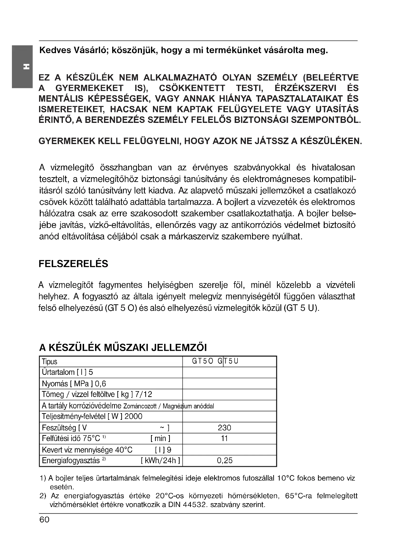 [ kWh/24h ] 0,25 TIKI Navodila_ GT KODA 627 JUL04 copy.qxd 25.8.2004 9:09 Page 60 felső elhelyezésű (GT 5 O ) és alsó elhelyezésű vízmelegítők közül (GT 5 U ). EZ A KÉSZÜLÉK NEM ALKALMAZHATÓ OLYAN SZEMÉLY (BELEÉRTVE A GYERMEKEKET IS), CSÖKKENTETT TESTI, ÉRZÉKSZERVI ÉS MENTÁLIS KÉPESSÉGEK, VAGY ANNAK HIÁNYA TAPASZTALATAIKAT ÉS ISMERETEIKET, HACSAK NEM KAPTAK FELÜGYELETE VAGY UTASÍTÁS ÉRINTŐ, A BERENDEZÉS SZEMÉLY FELELŐS BIZTONSÁGI SZEMPONTBÓL. GYERMEKEK KELL FELÜGYELNI, HOGY AZOK NE JÁTSSZ A KÉSZÜLÉKEN.61