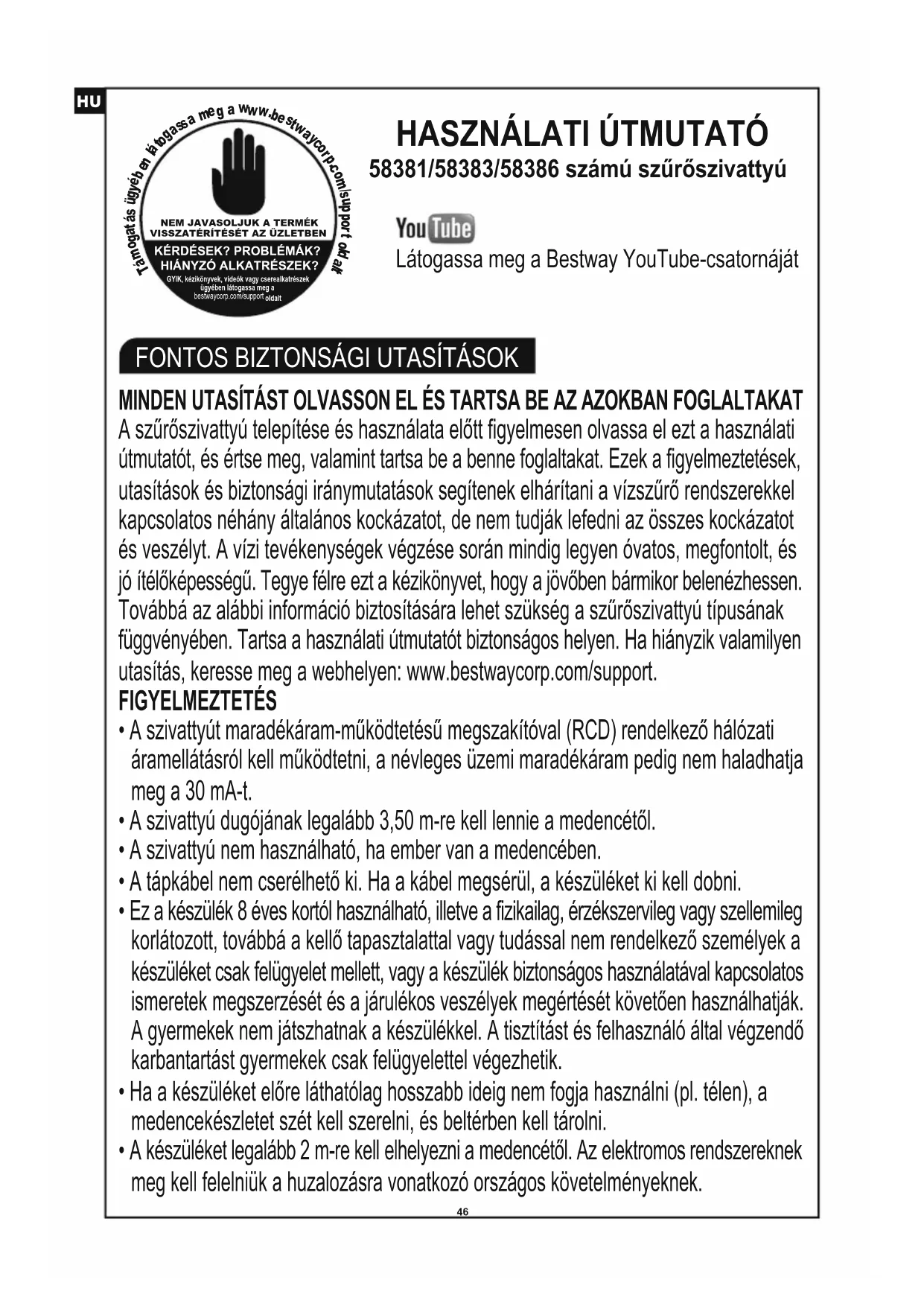 tÁRTALMATLANÍTÁS MINDEN UTASÍTÁST OLVASSON EL ÉS TARTSA BE AZ AZOKBAN FOGLALTAKAT A szűrőszivattyú telepítése és használata előtt figyelmesen olvassa el ezt a használati útmutatót, és értse meg, valamint tartsa be a benne foglaltakat. Ezek a figyelmeztetések, utasítások és biztonsági iránymutatások segítenek elhárítani a vízszűrő rendszerekkel kapcsolatos néhány általános kockázatot, de nem tudják lefedni az összes kockázatot és veszélyt. A vízi tevékenységek végzése során mindig legyen óvatos, megfontolt, és jó ítélőképességű. Tegye félre ezt a kézikönyvet, hogy a jövőben bármikor belenézhessen. Továbbá az alábbi információ biztosítására lehet szükség a szűrőszivattyú típusának függvényében. Tartsa a használati útmutatót biztonságos helyen. Ha hiányzik valamilyen utasítás, keresse meg a webhelyen: www.bestwaycorp.com/support. FIGYELMEZTETÉS
