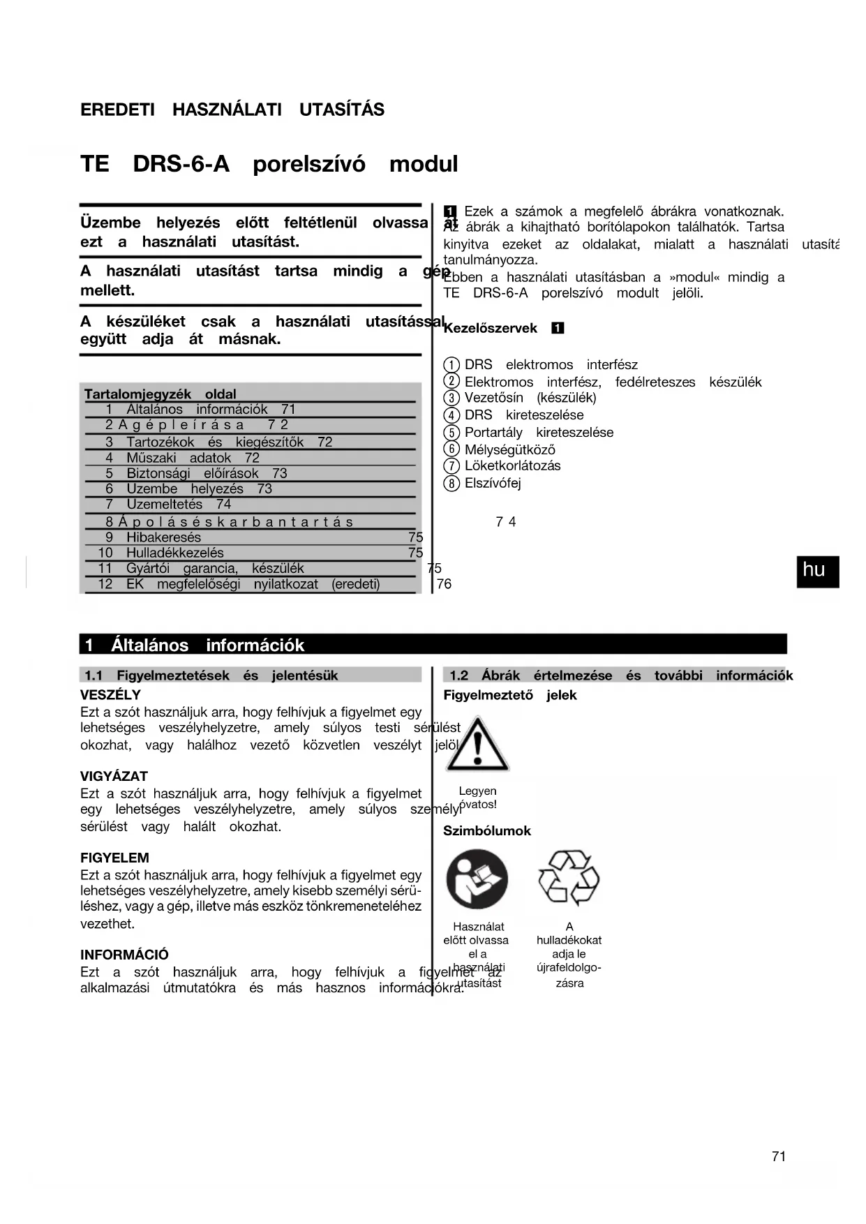 Printed: 08.07.2013 | Doc-Nr: PUB / 5071244 / 000 / 02EREDETI HASZNÁLATI UTASÍTÁS TE DRS‑6‑A porelszívó modul Üzembe helyezés előtt feltétlenül olvassa át ezt a használati utasítást. A használati utasítást tartsa mindig a gép mellett. A készüléket csak a használati utasítással együtt adja át másnak. Tartalomjegyzék oldal1 Általános információk 712Agépleírása 723 Tartozékok és kiegészítők 724 Műszaki adatok 725 Biztonsági előírások 736 Üzembe helyezés 737 Üzemeltetés 748Ápoláséskarbantartás 749 Hibakeresés 7510 Hulladékkezelés 7511 Gyártói garancia, készülék 7512 EK megfelelőségi nyilatkozat (eredeti) 76 1 Ezek a számok a megfelelő ábrákra vonatkoznak. Az ábrák a kihajtható borítólapokon találhatók. Tartsa kinyitva ezeket az oldalakat, mialatt a használati utasításttanulmányozza. Ebben a használati utasításban a »modul« mindig a TE DRS‑6‑A porelszívó modult jelöli.Kezelőszervek 1 DRS elektromos interfész Elektromos interfész, fedélreteszes készülék Vezetősín (készülék) DRS kireteszelése Portartály kireteszelése Mélységütköző Löketkorlátozás Elszívófej 1 Általános információk