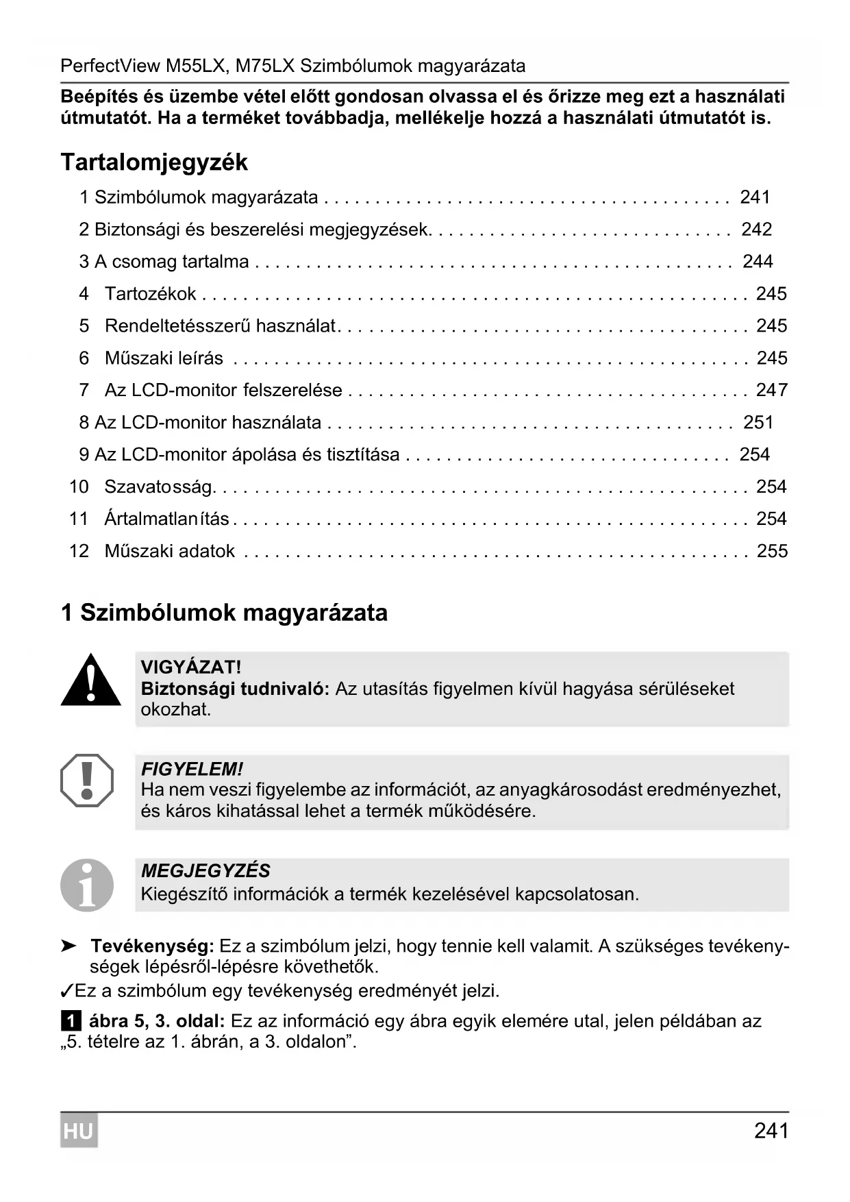 ➤ Tevékenység: Ez a szimbólum jelzi, hogy tennie kell valamit. A szükséges tevékeny- ségek lépésről-lépésre követhetők. ✓ Ez a szimbólum egy tevékenység eredményét jelzi. 1 ábra 5, 3. oldal: Ez az információ egy ábra egyik elemére utal, jelen példában az „5. tételre az 1. ábrán, a 3. oldalon”. VIGYÁZAT! Biztonsági tudnivaló: Az utasítás figyelmen kívül hagyása sérüléseket okozhat. FIGYELEM! Ha nem veszi figyelembe az információt, az anyagkárosodást eredményezhet, és káros kihatással lehet a termék működésére. MEGJEGYZÉS Kiegészítő információk a termék kezelésével kapcsolatosan.Biztonsági és beszerelési megjegyzések PerfectView M55LX, M75LX
