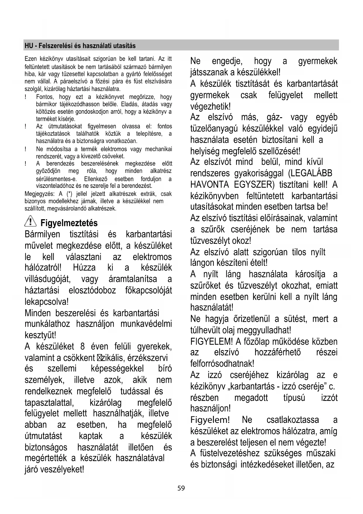 Ak by osvetlenie nefungovalo, skôr ako zavoláte servis overte správne nasadenie žiaroviek do sedla.59 HU - Felszerelési és használati utasítás Ezen kézikönyv utasításait szigorúan be kell tartani. Az itt feltüntetett utasítások be nem tartásából származó bármilyen hiba, kár vagy tűzesettel kapcsolatban a gyártó felelősséget nem vállal. A páraelszívó a főzési pára és füst elszívására szolgál, kizárólag háztartási használatra. ! Fontos, hogy ezt a kézikönyvet megőrizze, hogy bármikor tájékozódhasson belőle. Eladás, átadás vagy költözés esetén gondoskodjon arról, hogy a kézikönyv a terméket kísérje. ! Az útmutatásokat figyelmesen olvassa el: fontos tájékoztatások találhatók köztük a telepítésre, a használatra és a biztonságra vonatkozóan. ! Ne módosítsa a termék elektromos vagy mechanikai rendszerét, vagy a kivezető csöveket. ! A berendezés beszerelésének megkezdése előtt győződjön meg róla, hogy minden alkatrész sérülésmentes-e. Ellenkező esetben forduljon a viszonteladóhoz és ne szerelje fel a berendezést. Megjegyzés: A (*) jellel jelzett alkatrészek extrák, csak bizonyos modellekhez járnak, illetve a készülékkel nem szállított, megvásárolandó alkatrészek. Figyelmeztetés Bármilyen tisztítási és karbantartási művelet megkezdése előtt, a készüléket le kell választani az elektromos hálózatról! Húzza ki a készülék villásdugóját, vagy áramtalanítsa a háztartási elosztódoboz főkapcsolóját lekapcsolva! Minden beszerelési és karbantartási munkálathoz használjon munkavédelmi kesztyűt! A készüléket 8 éven felüli gyerekek, valamint a csökkent zikális, érzékszervi és szellemi képességekkel bíró személyek, illetve azok, akik nem rendelkeznek megfelelő tudással és tapasztalattal, kizárólag megfelelő felügyelet mellett használhatják, illetve abban az esetben, ha megfelelő útmutatást kaptak a készülék biztonságos használatát illetően és megértették a készülék használatával járó veszélyeket! Ne engedje, hogy a gyermekek játsszanak a készülékkel! A készülék tisztítását és karbantartását gyermekek csak felügyelet mellett végezhetik! Az elszívó más, gáz- vagy egyéb tüzelőanyagú készülékkel való egyidejű használata esetén biztosítani kell a helyiség megfelelő szellőzését! Az elszívót mind belül, mind kívül rendszeres gyakorisággal (LEGALÁBB HAVONTA EGYSZER) tisztítani kell! A kézikönyvben feltüntetett karbantartási utasításokat minden esetben tartsa be! Az elszívó tisztítási előírásainak, valamint a szűrők cseréjének be nem tartása tűzveszélyt okoz! Az elszívó alatt szigorúan tilos nyílt lángon készíteni ételt! A nyílt láng használata károsítja a szűrőket és tűzveszélyt okozhat, emiatt minden esetben kerülni kell a nyílt láng használatát! Ne hagyja őrizetlenül a sütést, mert a túlhevült olaj meggyulladhat! FIGYELEM! A főzőlap működése közben az elszívó hozzáférhető részei felforrósodhatnak! Az izzó cseréjéhez kizárólag az e kézikönyv „karbantartás - izzó cseréje” c. részben megadott típusú izzót használjon! Figyelem! Ne csatlakoztassa a készüléket az elektromos hálózatra, amíg a beszerelést teljesen el nem végezte! A füstelvezetéshez szükséges műszaki és biztonsági intézkedéseket illetően, az60 illetékes helyi hatóságok vonatkozó rendeleteit szigorúan tartsa be! A keringetett levegőt nem szabad a gáz- vagy egyéb égéstermék üzemű készülékek füstjének elvezetéshez használt csőben szállítani! Ne használja az elszívót helytelenül felszerelt lámpával, illetve ne hagyja azt lámpa nélkül, mert áramütést okozhat! Soha ne használja az elszívót felszerelt rostély nélkül! Az elszívót SOHA ne használja tárolófelületként, hacsak az ilyen célra való használata nincs egyértelműen jelezve! Beszereléshez kizárólag a készülékhez mellékelt csavarokat használja! Amennyiben a csavar nem része a csomagnak, ügyeljen a megfelelő típusú csavarok beszerezésére! A beszerelési útmutatóban feltüntetett, megfelelő hosszúságú csavarokat használjon! Kétség esetén kérjen tájékoztatást a szakszerviztől, vagy hasonló képesítésű személyzettől! FIGYELEM! A csavarok és rögzítő elemeknek nem az útmutató szerinti felhelyezése áramütés-veszélyt okozhat! A kézikönyvben leírtak be nem tartása miatt bekövetkező esetleges kellemetlenségekért, károkért vagy tűzkárokért felelősséget nem vállalunk! A készüléken található jelzés megfelel az elektromos és elektronikus berendezések hulladékairól szóló 2012/19/EC európai irányelvben (WEEE) foglalt előírásoknak. A hulladékká vált termék szabályszerű elhe lyezésével Ön segít elkerülni a környezettel és az emberi egészséggel kapcsolatos azon esetleges negatív következményeket, amelyeket a termék nem megfelelő hulladékkezelése egyébként okozhatna. A terméken vagy a termékhez mellékelt dokumentumokon feltüntetett jelzés arra utal, hogy ez a termék nem kezelhető háztartási hulladékként. Ehelyett a terméket a villamos és elektronikus berendezések újrahasznosítását végző telephelyek valamelyikén kell leadni. Kiselejtezéskor a hulladékeltávolításra vonatkozó helyi környezetvédelmi előírások szerint kell eljárni. A termék kezelésével, hasznosításával és újrahasznosításával kapcsolatos bővebb tájékoztatásért forduljon a lakóhelye szerinti polgármesteri hivatalhoz, a háztartási hulladékok kezelését végző társasághoz vagy ahhoz a bolthoz, ahol a terméket vásárolta. A berendezést a következő szabványoknak megfelelően tervezték, gyártották, és ellenőrizték: