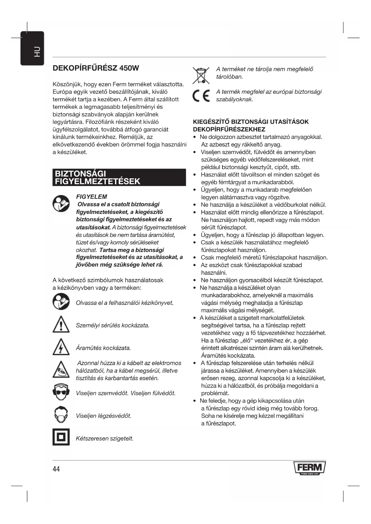 Köszönjük, hogy ezen Ferm terméket választotta. Európa egyik vezető beszállítójának, kiváló termékét tartja a kezében. A Ferm által szállított termékek a legmagasabb teljesítményi és biztonsági szabványok alapján kerülnek legyártásra. Filozófiánk részeként kiváló ügyfélszolgálatot, továbbá átfogó garanciát kínálunk termékeinkhez. Reméljük, az elkövetkezendő években örömmel fogja használni a készüléket. BIZTONSÁGI FIGYELMEZTETÉSEK FIGYELEM Olvassa el a csatolt biztonsági figyelmeztetéseket, a kiegészítő biztonsági figyelmeztetéseket és az utasításokat. A biztonsági figyelmeztetések és utasítások be nem tartása áramütést, tüzet és/vagy komoly sérüléseket okozhat. Tartsa meg a biztonsági figyelmeztetéseket és az utasításokat, a jövőben még szüksége lehet rá. A következő szimbólumok használatosak a kézikönyvben vagy a terméken: Olvassa el a felhasználói kézikönyvet. Személyi sérülés kockázata. Áramütés kockázata. Azonnal húzza ki a kábelt az elektromos hálózatból, ha a kábel megsérül, illetve tisztítás és karbantartás esetén. Viseljen szemvédőt. Viseljen fülvédőt. Viseljen légzésvédőt. Kétszeresen szigetelt. A terméket ne tárolja nem megfelelő tárolóban. A termék megfelel az európai biztonsági szabályoknak. KIEGÉSZÍTŐ BIZTONSÁGI UTASÍTÁSOK