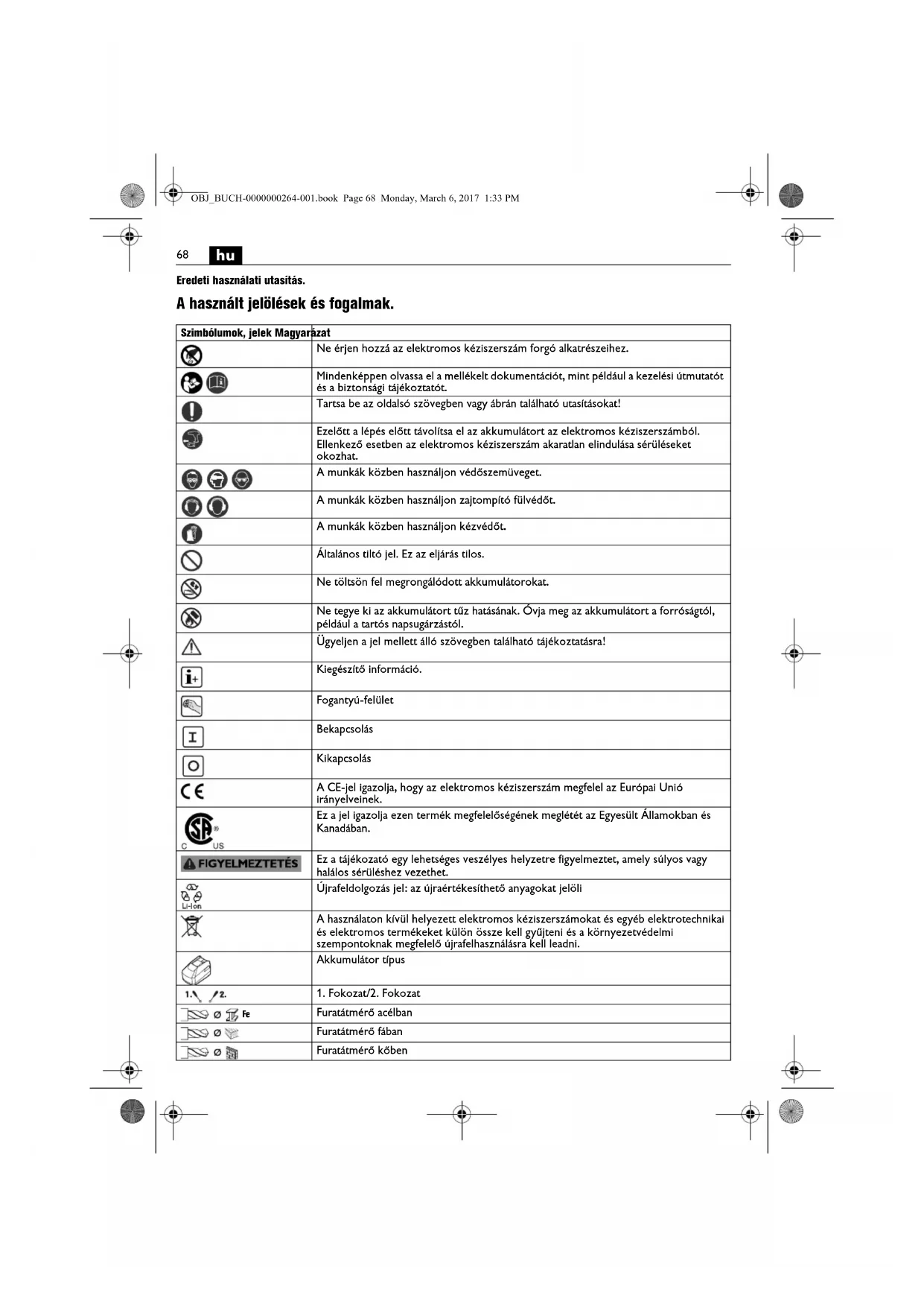 | [1Y50S] | A használaton kívül helyezett elektromos kéziszerszámokat és egyéb elektrotechnikai és elektromos termékeket külön össze kell gyűjteni és a környezetvédelmi szempontoknak megfelelő újrafelhasználásra kell leadni. |