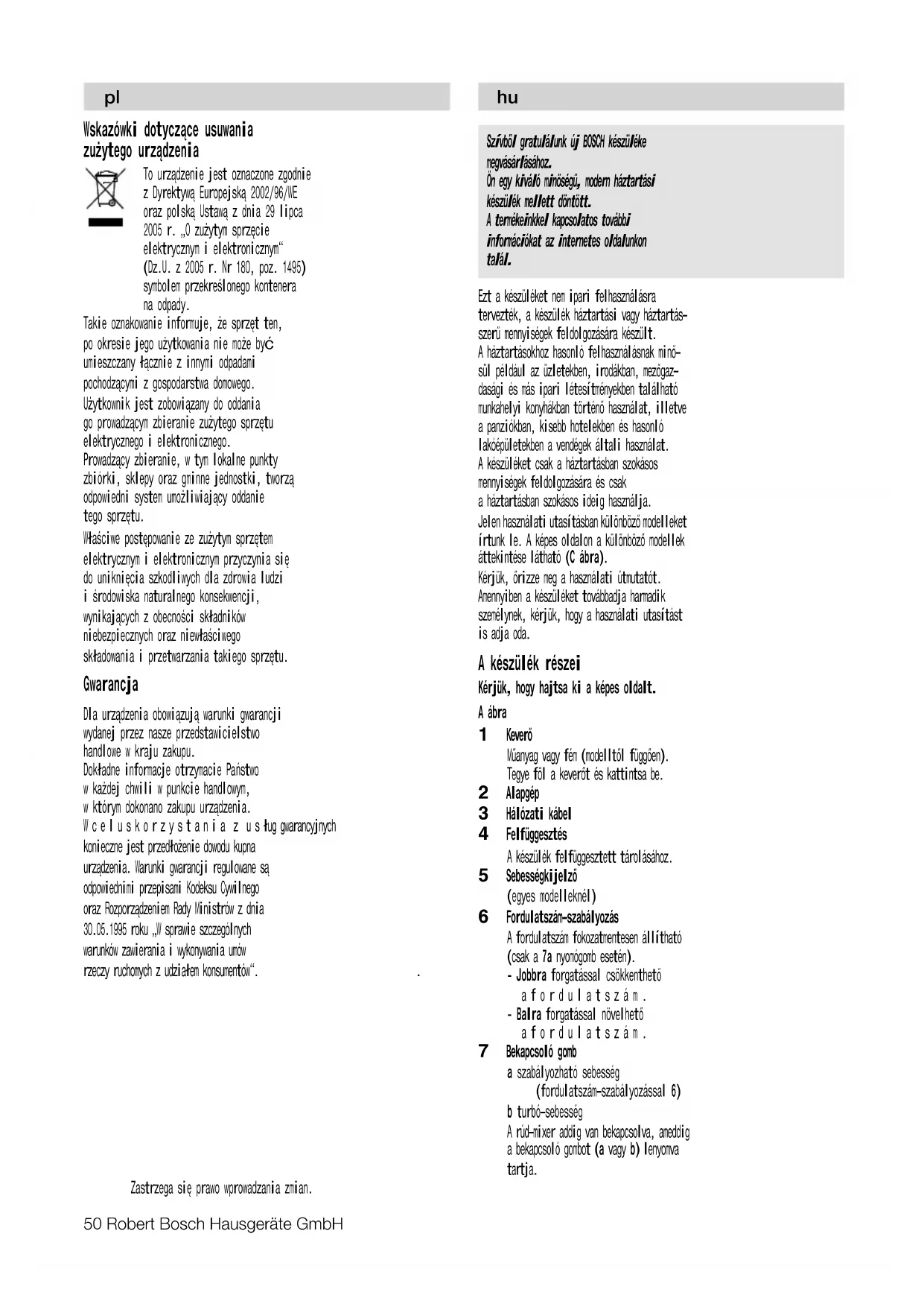Kapcsolja be ismét akészüléket.Robert Bosch Hausgeräte GmbH 53 Crepes-tészta 250 ml tej 1 db tojás 100 g liszt 25 g felolvasztott, majd lehûtött vaj Az összetevõket a megadott sorrendben egy edénybe tesszük és sima tésztává keverjük. Tejes turmixitalok 1 pohár tej 6 nagy szem eper vagy 10 szem málna vagy 1 banán (darabokra vágva) A hozzávalókat egy edénybe tesszük és elkeverjük. Ízlés szerint édesítjük. Hasznos tanács: A tejes turmixitalhoz adjon egy gombóc fagylaltot vagy elkészítéséhez nagyon hideg tejet használjon. Ártalmatlanítás A készülék a 2002/96/EG, az elektro- mos és elektronikus használt készülé- kekrõl szóló (waste electrical and electronic equipment – WEEE) európai irányelveknek megfelelõen van jelölve. Ez az irányelv megszabja a használt készülékek visszavételének és értékesíté- sének kereteit az egész EU-ban érvényes módon. Az aktuális ártalmatlanítási útmutatásokról kérjük, tájékozódjon szakkereskedõjénél vagy a helyi önkormányzatnál. Garanciális feltételek A garanciális feltételeket a 117/1991 (IX. 10) számú kormányrendelet szabályozza. 72 órán belüli meghibásodás esetén a készüléket a kereskedelem kicseréli. Ezután vevõszolgálatunk gondoskodik az elõírt 15 napon belüli, kölcsönkészülék biztosítása esetén 30 napon belüli javításról. A garanciális szolgáltatásokat a vásárlásnál kapott, szabályosan kitöltött garanciajeggyel lehet igénybevenni, amely minden egyéb garanciális feltételt is részletesen ismertet. Minõségtanúsítás: A 2/1984. (111.10.) BkM-IpM számú rendelete alapján, mint forgalmazó tanúsítjuk, hogy a készülék a vásárlási tájékoztatóban közölt adatoknak megfelel. Ýe¼ ÿpåæaª ÿpåμ¸añe¸å¼ ªæø ²å¹®º ªo¯aò¸¿o¯º ¨ocÿoªapc¹i, a ¸e ªæø ÿpo¯åcæoo¨o å®opåc¹a¸¸ø. Bå®opåc¹oº¼¹e ÿpåæaª æåòe ªæø ÿepepo¢®å ÿpoªº®¹i º μåña¼¸åx ªæø ªo¯aò¸¿o¨o ¨ocÿoªapc¹a ®iæ¿®oc¹i i iªpiμ®ax ñacº. ýi¼ i¸c¹pº®ýiï μ å®opåc¹a¸¸ø oÿåcº÷¹¿cø piμ¸i ¯oªeæi. C¹opi¸®å μ ¯aæ÷¸®a¯å ¯ic¹ø¹¿ o¨æøª piμ¸åx ¯oªeæe¼ (Maæ÷¸o® C). ³¢epi¨a¼¹e, ¢ºª¿ æac®a, i¸c¹pº®ýi÷ μå®opåc¹a¸¸ø. ¥epeªa¼¹e i¸òå¯ ®opåc¹ºaña¯ paμo¯ μ ÿpåæaªo¯ i¸c¹pº®ýi÷ μ å®opåc¹a¸¸ø. Kopo¹®å¼ o¨æøª ¡ºª¿ æac®a, poμ¨op¸i¹¿ c¹opi¸®å μ ¯aæ÷¸®a¯å. Maæ÷¸o® A 1Hi²®a ¢æe¸ªepa ¥æac¹å® a¢o ¯e¹aæ ( μaæe²¸oc¹i iª ¯oªeæi). c¹a¹e ¸i²®º ¢æe¸ªepa ¹a®, óo¢ o¸a ñº¹¸o μa¼òæa ÿaμ. 2Oc¸o¸å¼ ¢æo® ÿpåæaªº 3 Eæe®¹po®a¢eæ¿ 4¥iªic¸a ÿe¹æåýø ©æø μ¢epi¨a¸¸ø ÿpåæaªº ÿiªiòe¸o¯º c¹a¸i. 5I¸ªå®a¹op ò媮oc¹i ( ªeø®åx ¯oªeæøx) 6Pe¨ºæø¹op ò媮oc¹i Ò媮ic¹¿ pe¨ºæ÷ƒ¹¿cø ¢eμc¹ºÿi¸ña¹o (æåòe paμo¯ iμ ®¸oÿ®o÷ 7a). — O¢ep¹ ÿpaopºñ μ¸å²ºƒ ò媮ic¹¿. — O¢ep¹ æiopºñ ÿiªåóºƒ ò媮ic¹¿. 7K¸oÿ®a i¯®¸e¸¸ø a Pe¨ºæ¿oa¸a ò媮ic¹¿ (pe¨ºæø¹op ò媮oc¹i 6) b ™ºp¢o-pe²å¯ ¡æe¸ªep i¯®¸º¹å¼, ÿo®å ¸a¹åc¸º¹a ®¸oÿ®a i¯®¸e¸¸ø (a a¢o b).