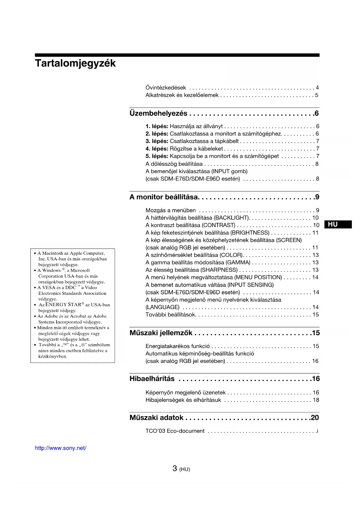 A dőlésszög beállítása . . . . . . . . . . . . . . . . . . . . . . . . . . . . . . . . . . . 8 A bemenőjel kiválasztása (INPUT gomb) (csak SDM-E76D/SDM-E96D esetén) . . . . . . . . . . . . . . . . . . . . . . . 8 A monitor beállítása. . . . . . . . . . . . . . . . . . . . . . . . . . . . . .9 Mozgás a menüben . . . . . . . . . . . . . . . . . . . . . . . . . . . . . . . . . . . . . 9 A háttérvilágítás beállítása (BACKLIGHT). . . . . . . . . . . . . . . . . . . . 10 A kontraszt beállítása (CONTRAST) . . . . . . . . . . . . . . . . . . . . . . . . 10 A kép feketeszintjének beállítása (BRIGHTNESS) . . . . . . . . . . . . . 11 A kép élességének és középhelyzetének beállítása (SCREEN) (csak analóg RGB jel esetében) . . . . . . . . . . . . . . . . . . . . . . . . . . . 11 A színhőmérséklet beállítása (COLOR). . . . . . . . . . . . . . . . . . . . . . 13 A gamma beállítás módosítása (GAMMA) . . . . . . . . . . . . . . . . . . . 13 Az élesség beállítása (SHARPNESS) . . . . . . . . . . . . . . . . . . . . . . . 13 A menü helyének megváltoztatása (MENU POSITION) . . . . . . . . . 14 A bemenet automatikus váltása (INPUT SENSING) (csak SDM-E76D/SDM-E96D esetén) . . . . . . . . . . . . . . . . . . . . . . 14 A képernyőn megjelenő menü nyelvének kiválasztása (LANGUAGE) . . . . . . . . . . . . . . . . . . . . . . . . . . . . . . . . . . . . . . . . . 14 További beállítások. . . . . . . . . . . . . . . . . . . . . . . . . . . . . . . . . . . . . 15 Műszaki jellemzők . . . . . . . . . . . . . . . . . . . . . . . . . . . . . .15 Energiatakarékos funkció . . . . . . . . . . . . . . . . . . . . . . . . . . . . . . . . 15 Automatikus képminőség-beállítás funkció (csak analóg RGB jel esetében) . . . . . . . . . . . . . . . . . . . . . . . . . . . 16 Hibaelhárítás . . . . . . . . . . . . . . . . . . . . . . . . . . . . . . . . . .16 Képernyőn megjelenő üzenetek . . . . . . . . . . . . . . . . . . . . . . . . . . . 16 Hibajelenségek és elhárításuk . . . . . . . . . . . . . . . . . . . . . . . . . . . . 18 Műszaki adatok . . . . . . . . . . . . . . . . . . . . . . . . . . . . . . . .20 TCO’03 Eco-document . . . . . . . . . . . . . . . . . . . . . . . . . . . . . . . . . . .i4 (HU) Óvintézkedések Az elektromos csatlakoztatásra vonatkozó figyelmeztetések