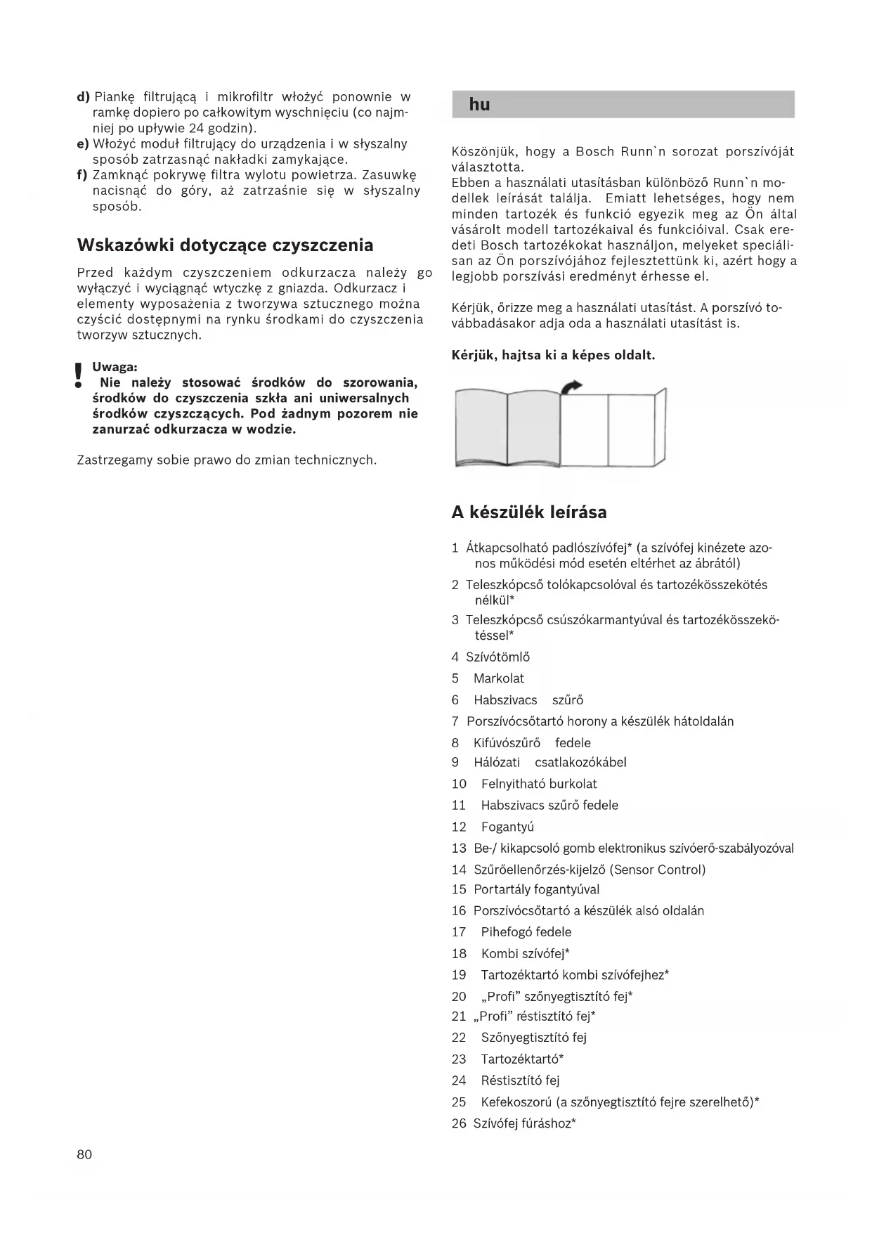 Köszönjük, hogy a Bosch Runn`n sorozat porszívóját választotta. Ebben a használati utasításban különböző Runn`n mo- dellek leírását találja. Emiatt lehetséges, hogy nem minden tartozék és funkció egyezik meg az Ön által vásárolt modell tartozékaival és funkcióival. Csak ere- deti Bosch tartozékokat használjon, melyeket speciáli- san az Ön porszívójához fejlesztettünk ki, azért hogy a legjobb porszívási eredményt érhesse el. Kérjük, őrizze meg a használati utasítást. A porszívó to- vábbadásakor adja oda a használati utasítást is. Kérjük, hajtsa ki a képes oldalt. A készülék leírása 1 Átkapcsolható padlószívófej* (a szívófej kinézete azo- nos működési mód esetén eltérhet az ábrától) 2 Teleszkópcső tolókapcsolóval és tartozékösszekötés nélkül* 3 Teleszkópcső csúszókarmantyúval és tartozékösszekö- téssel* 4 Szívótömlő 5 Markolat 6 Habszivacs szűrő 7 Porszívócsőtartó horony a készülék hátoldalán 8 Kifúvószűrő fedele 9 Hálózati csatlakozókábel 10 Felnyitható burkolat 11 Habszivacs szűrő fedele 12 Fogantyú 13 Be-/ kikapcsoló gomb elektronikus szívóerő-szabályozóval 14 Szűrőellenőrzés-kijelző (Sensor Control) 15 Portartály fogantyúval 16 Porszívócsőtartó a készülék alsó oldalán 17 Pihefogó fedele 18 Kombi szívófej* 19 Tartozéktartó kombi szívófejhez* 20 „Profi” szőnyegtisztító fej* 21 „Profi” réstisztító fej* 22 Szőnyegtisztító fej 23 Tartozéktartó* 24 Réstisztító fej 25 Kefekoszorú (a szőnyegtisztító fejre szerelhető)* 26 Szívófej fúráshoz*81