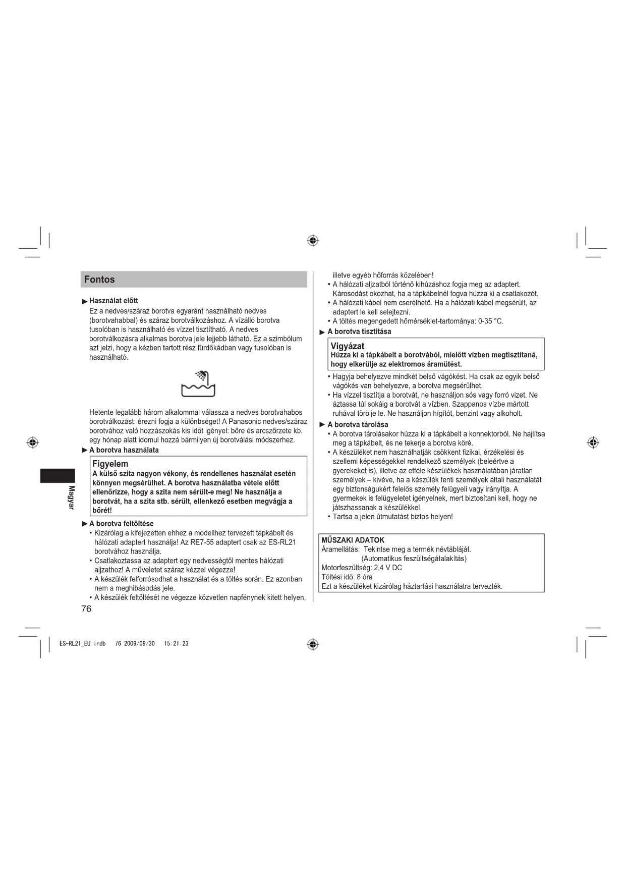 miesta, kde budú prijaté bez poplatku v súlade so Smernicami 2002/96/ES a 2006/66/ES. V niektorých krajinách je možné tieto produkty vrátit’ priamo miestnemu maloobchodu v prípade, ak si objednáte podobný nový výrobok. Správna likvidácia týchto produktov pomôže ušetrit’ hodnotné zdroje a zabránit’ možným negatívnym vplyvom na l’udské zdravie a prostredie, ktoré môžu vzniknút’ z nesprávneho zaobchádzania s odpadom. Pre bližšie informácie o vašom najbližšom zbernom mieste kontaktujte, prosím, vaše miestne úrady. V prípade nesprávnej likvidácie odpadu môžu byt’uplatnené pokuty v súlade so štátnou legislatívou. Pre právnické osoby v Európskej únii Ak potrebujete zlikvidovat’ opotrebované elektrické a elektronické produkty, pre bližšie informácie kontaktujte, prosím, svojho miestneho predajcu alebo dodávatel’a. [Informácie o likvidácii elektrického a elektronického odpadu v krajinách mimo Európskej únie] Tieto symboly platia iba v Európskej únii. Ak si prajete zlikvidovat’ tento produkt alebo batériu, pre bližšie informácie kontaktujte, prosím, vaše miestne úrady alebo predajcu a informujte sa o správnej metóde likvidácie. Poznámka k symbolu batérie (symbol v strede a dole) Tento symbol môže byť použitý v kombinácii s chemickým symbolom. Chemický symbol určuje obsiahnutú chemickú látku v súlade s príslušnými Smernicami ES. ES-RL21_EU.indb 75 2009/09/30 15:21:2376 Magyar Fontos Használat előtt Ez a nedves/száraz borotva egyaránt használható nedves (borotvahabbal) és száraz borotválkozáshoz. A vízálló borotva tusolóban is használható és vízzel tisztítható. A nedves borotválkozásra alkalmas borotva jele lejjebb látható. Ez a szimbólum azt jelzi, hogy a kézben tartott rész fürdőkádban vagy tusolóban is használható. Hetente legalább három alkalommal válassza a nedves borotvahabos borotválkozást: érezni fogja a különbséget! A Panasonic nedves/száraz borotvához való hozzászokás kis időt igényel: bőre és arcszőrzete kb. egy hónap alatt idomul hozzá bármilyen új borotválási módszerhez. A borotva használata Figyelem A külső szita nagyon vékony, és rendellenes használat esetén könnyen megsérülhet. A borotva használatba vétele előtt ellenőrizze, hogy a szita nem sérült-e meg! Ne használja a borotvát, ha a szita stb. sérült, ellenkező esetben megvágja a bőrét! A borotva feltöltése Kizárólag a kifejezetten ehhez a modellhez tervezett tápkábelt és hálózati adaptert használja! Az RE7-55 adaptert csak az ES-RL21 borotvához használja. Csatlakoztassa az adaptert egy nedvességtől mentes hálózati aljzathoz! A műveletet száraz kézzel végezze! A készülék felforrósodhat a használat és a töltés során. Ez azonban nem a meghibásodás jele. A készülék feltöltését ne végezze közvetlen napfénynek kitett helyen,